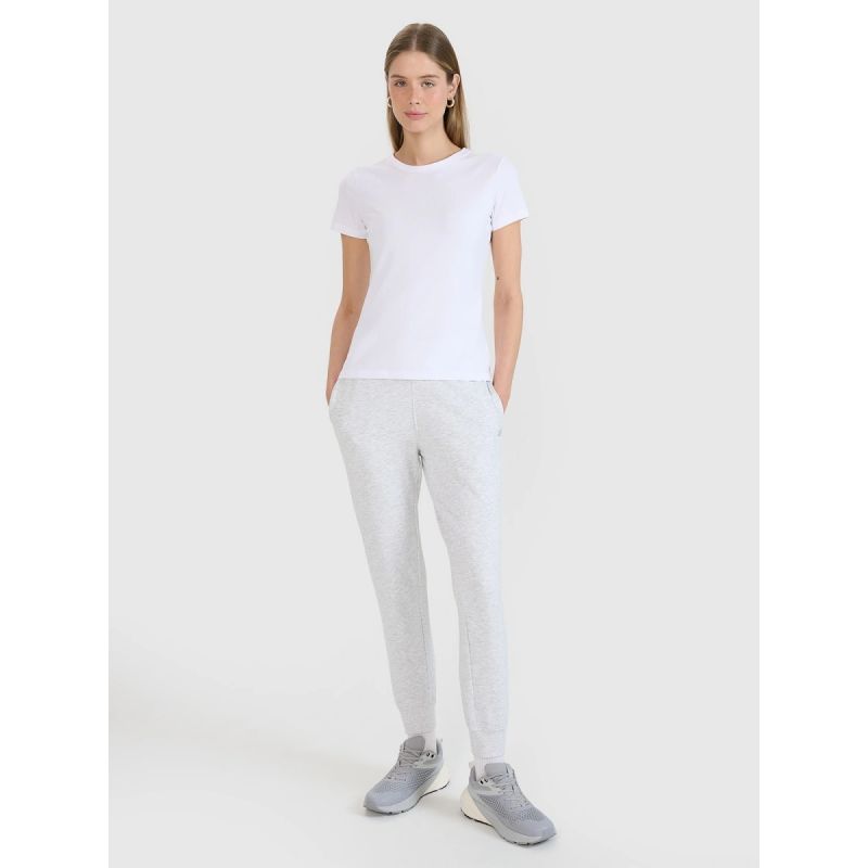 Ten damski T-shirt 4F świetnie sprawdzi się jako element casualowych i sportowych stylizacji. Krój slim dopasowuje się do sylwetki, podkreślając jej linię, a standardowa długość gwarantuje wygodę noszenia przez cały dzień. Dzianina single jersey o gładkiej powierzchni zapewnia miękkość, elastyczność i komfort, a dzięki gramaturze 180 gsm materiał dobrze się układa, nie prześwituje i jest odpowiedni na cały rok. Wykonanie z 95% bawełny oraz 5% elastanu sprawia, że koszulka jest przyjemna w dotyku, trwała i delikatnie rozciągliwa. Okrągły dekolt z ribowaniem zapewnia estetyczne wykończenie, a nadruk "4F" na froncie dodaje nowoczesnego, sportowego akcentu.