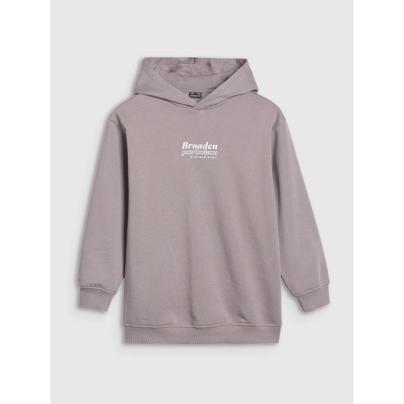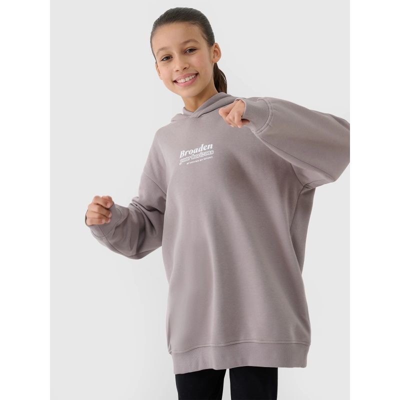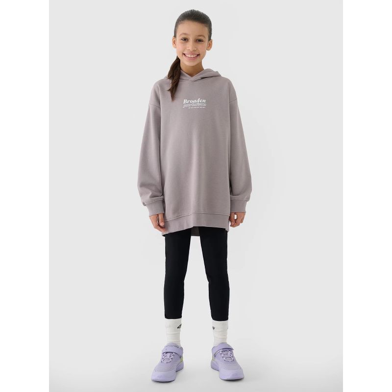 Ta dziewczęca bluza dresowa została stworzona z myślą o wygodzie i codziennej aktywności. Oversizowy krój luźno układa się na sylwetce, dając pełną swobodę ruchów, a miękka dzianina single jersey zapewnia elastyczność i komfort noszenia. Dzięki gramaturze 240 gsm bluza jest przewiewna, ale nadal przyjemnie miękka, a jednostronnie czesane wnętrze gwarantuje dodatkowe ciepło na chłodniejsze dni. Wykonana w 70% z bawełny i 30% z poliestru, łączy trwałość, miękkość i odporność na zużycie. Zintegrowany kaptur, elastyczne mankiety oraz dół ze ściągaczem zwiększają wygodę, a nadruk „Broaden Your Horizons” dodaje dziewczęcego charakteru. Idealna do szkoły, na trening i do codziennych stylizacji.