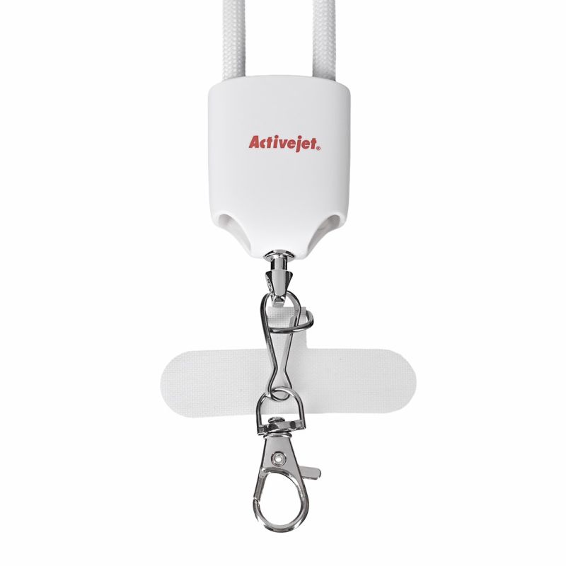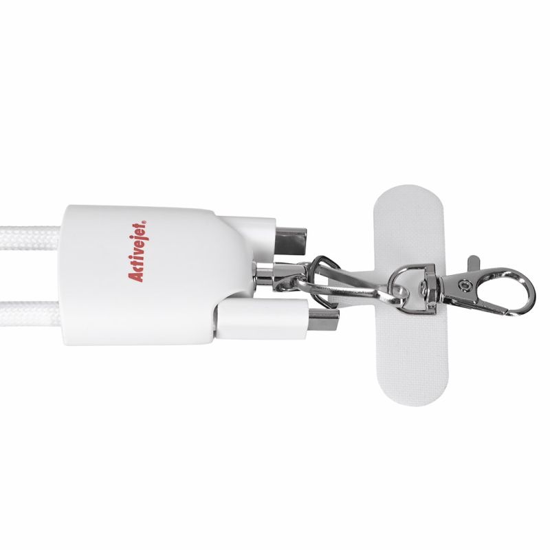 Activejet smycz z przewodem do ładowania 3w1 biała. Końcówki z różnymi złączami: USB-C, Adapter Lightning, USB-A.