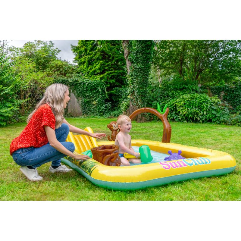 Basen wyposażono dodatkowo nadmuchiwane drzewko z małpką, hipopotama, ptaszki, młotek oraz pieniek z kołami ringo do rzucania, dzięki czemu Twoje dziecko oprócz kąpieli będzie mogło trenować celność oraz bawić się jak w małpim gaju.