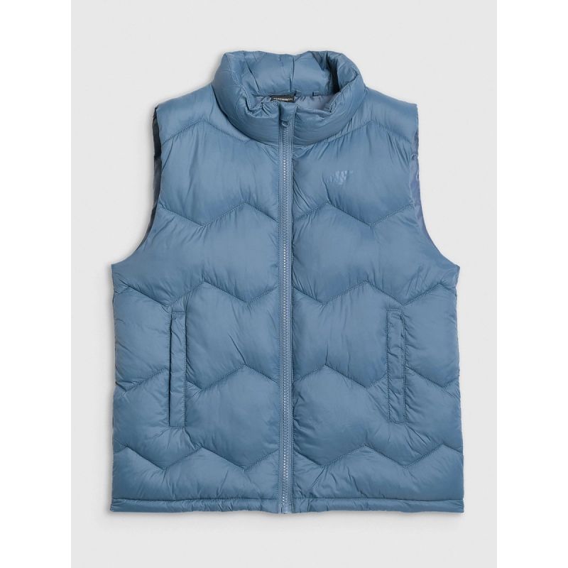 Ten pikowany bezrękawnik chłopięcy to praktyczne i wygodne rozwiązanie na chłodniejsze dni, idealne na co dzień oraz aktywności na zewnątrz. Poliestrowa ocieplina w panelach zapewnia ciepło bez nadmiernego obciążenia, a hydrofobowa powłoka ogranicza wchłanianie wilgoci, chroniąc przed lekkim deszczem. Pikowanie w zygzak zwiększa izolację i dodaje energii całemu fasonowi. Krój regular, długość do bioder oraz wysoki kołnierz gwarantują wygodę i ochronę przed chłodem, a zamek z plisą przeciwwiatrową zmniejsza przenikanie zimnego powietrza. Dwie boczne kieszenie zapewniają miejsce na drobiazgi lub szybkie ogrzanie dłoni. To lekki, wygodny i funkcjonalny bezrękawnik na codzienne wyzwania.