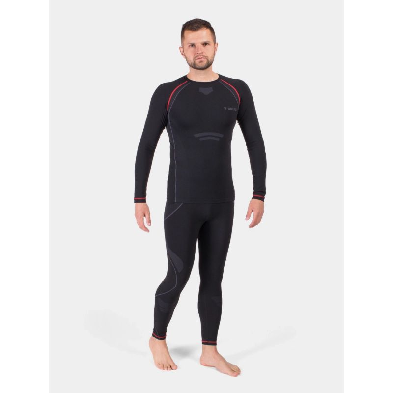 Komplet męskiej bielizny termoaktywnej BRUGI. Komplet koszulka longsleeve i długie getry. Odzież wykonano z wysokogatunkowych elastycznych materiałów termoaktywnych doskonale dopasowujących się do ciała oraz odprowadzających wilgoć na zewnątrz. Szybkoschnący materiał doskonale sprawdzi się podczas aktywności fizycznych oraz podczas użytku codziennego. Odzież tego typu może stanowić pierwszą warstwę termiczną (tzw. base layer) dla aktywnych użytkowników. Komplet bielizny idealny do biegania, na rower, w góry czy na narty lub snowboard. Bielizna doskonale sprawdzi się zarówno latem jak i zimą.