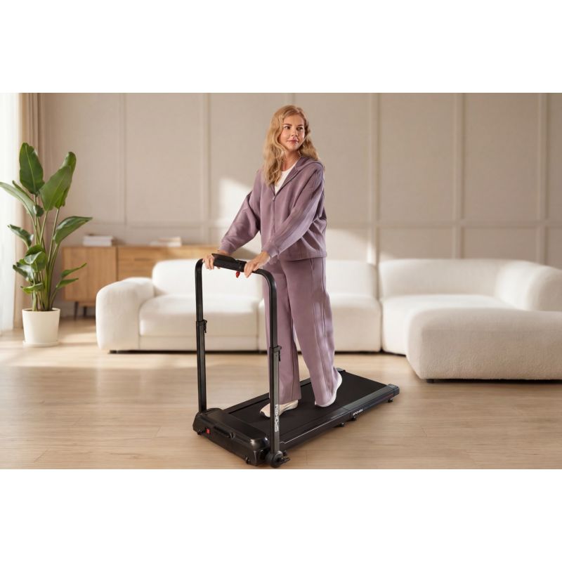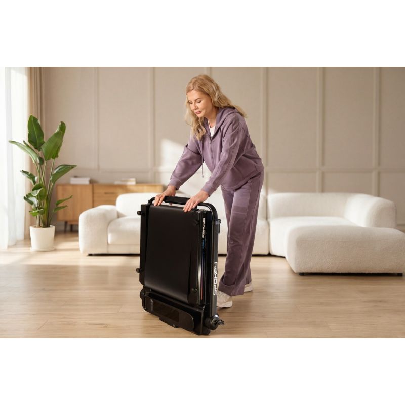 Składana bieżnia elektryczna typu walking pad DASH+ Spokey DASH+ to kompaktowa, składana na pół bieżnia typu walking pad, która sprawdzi się idealnie w domowych warunkach. Wyposażona w Bluetooth, uchwyt na telefon, klucz bezpieczeństwa i sterowanie pilotem, oferuje komfortowy trening nawet na niewielkiej przestrzeni. Wprowadzenie Spokey DASH+ to nowoczesna, składana na pół bieżnia typu walking pad, która łączy funkcjonalność z oszczędnością miejsca. Dzięki kompaktowej konstrukcji, wyświetlaczowi LED i intuicyjnemu pilotowi, bieżnia DASH+ sprawdzi się doskonale w domowych warunkach, umożliwiając komfortowy trening marszowy. Dodatkowe funkcje, takie jak Bluetooth, klucz bezpieczeństwa oraz uchwyt na smartfon, zwiększają wygodę i bezpieczeństwo użytkowania. Dlaczego warto wypróbować bieżnię elektryczną Spokey DASH+? BluetoothFunkcja Bluetooth umożliwia podłączenie zewnętrznych urządzeń, takich jak telefon czy tablet, bezpośrednio do bieżni. Dzięki temu możesz sterować muzyką z poziomu pilota, słuchać ulubionych utworów podczas treningu. Składana na półDASH+ została zaprojektowana z myślą o użytkownikach, którzy cenią sobie oszczędność miejsca. Bieżnia składa się na pół, co znacząco ułatwia jej przechowywanie – zarówno w pozycji pionowej, jak i poziomej. Idealne rozwiązanie do mniejszych mieszkań i domowych siłowni. Klucz bezpieczeństwaDla komfortu użytkowania bieżnię wyposażono w specjalny klucz bezpieczeństwa, który umożliwia natychmiastowe zatrzymanie pracy urządzenia w sytuacjach awaryjnych. Uchwyt na smartfonZintegrowany uchwyt na telefon lub tablet sprawia, że ulubione multimedia, aplikacje treningowe lub filmy masz zawsze na wyciągnięcie ręki. Możesz wygodnie korzystać z urządzenia mobilnego w trakcie marszu, bez obawy o jego stabilność. Pilot do regulacji prędkościDo bieżni dołączony jest pilot, który umożliwia płynną i wygodną regulację prędkości bez potrzeby zatrzymywania się. Co więcej, za pomocą pilota możesz również przełączać utwory w sparowanym urządzeniu, co jeszcze bardziej upraszcza obsługę i pozwala skupić się na treningu. Szczegółowy opis Bieżnia DASH+ to idealny wybór dla osób, które chcą trenować w komfortowych warunkach bez konieczności poświęcania dużej przestrzeni na sprzęt sportowy. Jej kompaktowa konstrukcja pozwala na łatwe przechowywanie – po treningu wystarczy ją złożyć i ustawić pionowo lub poziomo. Dzięki wyświetlaczowi LED użytkownik może śledzić najważniejsze parametry, takie jak czas, dystans, prędkość oraz kalorie. Sterowanie pilotem umożliwia płynne dopasowanie prędkości, a wbudowany moduł Bluetooth pozwala na połączenie z telefonem i sterowanie muzyką bez przerywania ćwiczeń. Bieżnię DASH+ wyposażono również w praktyczny uchwyt na smartfon i klucz bezpieczeństwa, który zapewni ochronę użytkownika w razie nagłej potrzeby zatrzymania bieżni. Dane techniczne Typ: bieżnia elektryczna (walking pad) Moc silnika: 1,25 HP DC Maksymalna prędkość: 6 km/h Wyświetlacz: LED Funkcje wyświetlacza: czas, dystans, prędkość, kalorie Rozmiar produktu: 128 × 67,5 × 97,5 cm Rozmiar po złożeniu: 79,5 x 67,5 x 16 cm Rozmiar pasa: 105 × 40 cm Przechowywanie: składana na pół, w pionie lub poziomie Waga urządzenia: 27 kg Maksymalna waga użytkownika: 110 kg Dodatki: uchwyt na smartfon, pilot, klucz bezpieczeństwa, pilot do regulacji prędkości Kółka transportowe: tak Certyfikaty, normy i ostrzeżenia Zgodność z normami bezpieczeństwa UE. Produkt przeznaczony wyłącznie do użytku domowego. Urządzenie nie jest przeznaczone dla dzieci. Użytkowanie i pielęgnacja Używaj bieżni na płaskiej, stabilnej i suchej powierzchni, z dala od wilgoci i źródeł ciepła. Przed rozpoczęciem treningu upewnij się, że bieżnia została prawidłowo rozłożona i zabezpieczona. Regularnie czyść pas bieżni i powierzchnie zewnętrzne suchą lub lekko wilgotną ściereczką. Nie używaj silnych detergentów ani środków chemicznych do czyszczenia. Nie dopuszczaj do gromadzenia się kurzu wokół silnika i mechanizmu składania. Po zakończeniu treningu odłącz bieżnię od zasilania. Składaj bieżnię wyłącznie po całkowitym zatrzymaniu i wychłodzeniu urządzenia. Przechowuj bieżnię w pozycji poziomej lub pionowej – zgodnie z miejscem i preferencją użytkownika. Regularnie sprawdzaj stan techniczny bieżni – napięcie pasa, stabilność elementów oraz sprawność pilota. Nie przekraczaj maksymalnej dopuszczalnej wagi użytkownika (110 kg). Dla własnego bezpieczeństwa nie używaj bieżni boso ani w nieodpowiednim obuwiu. Najczęściej zadawane pytaniaCzy bieżnia DASH+ nadaje się do biegania?Nie – DASH to walking pad, czyli model przeznaczony do chodzenia lub marszu. Maksymalna prędkość wynosi 6 km/h. Jakie urządzenia mogę podłączyć przez Bluetooth?Możesz połączyć telefon, tablet lub inne urządzenie mobilne, aby odtwarzać muzykę i sterować nią z poziomu pilota. Czy bieżnię można przechowywać w pozycji pionowej?Tak, DASH jest składana na pół i może być przechowywana zarówno w pionie, jak i w poziomie. Czy bieżn