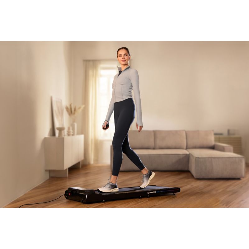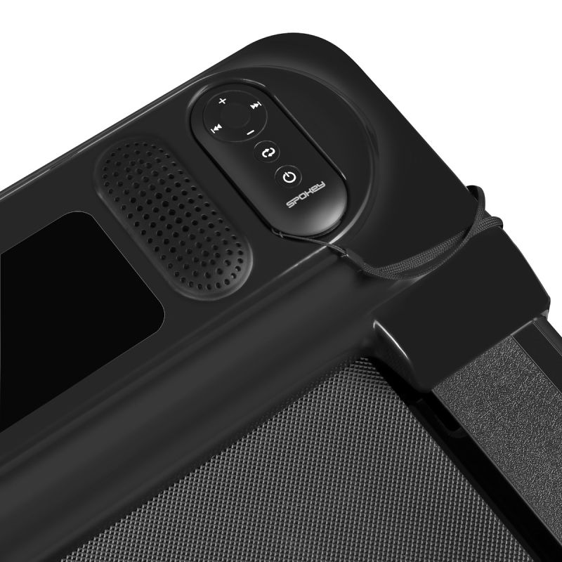 Bieżnia elektryczna typu walking pad DASH Składana bieżnia typu walking pad do marszu w domu. Wyświetlacz LED pokazuje czas, dystans, prędkość i spalone kalorie. Wbudowany moduł Bluetooth umożliwia połączenie z urządzeniami zewnętrznymi. Sterowanie pilotem. Antypoślizgowy pas bieżny. Składana na pół, do przechowywania w pionie lub poziomie. Wprowadzenie Kompaktowa, składana bieżnia DASH to idealne rozwiązanie dla osób, które chcą trenować w domu, ale nie mają zbyt dużo miejsca na rozłożenie sprzętu. Jej przemyślana konstrukcja typu walking pad umożliwia składanie na pół, dzięki czemu z łatwością zmieści się pod łóżkiem, w szafie lub za drzwiami. DASH wyposażona jest w czytelny wyświetlacz LED, łączność Bluetooth i pilot do wygodnego sterowania. Antypoślizgowy pas bieżny zapewnia stabilność podczas marszu, a maksymalna prędkość 6 km/h pozwala na bezpieczny, codzienny trening w rytmie slow. Dlaczego warto wypróbować bieżnię elektryczną Spokey DASH? BluetoothWbudowany moduł Bluetooth umożliwia połączenie bieżni z zewnętrznym urządzeniem, np. smartfonem. Dzięki temu możesz sterować muzyką lub przełączać utwory z poziomu pilota, bez konieczności sięgania po telefon w trakcie treningu. Składana na półMechanizm składania bieżni na pół pozwala zaoszczędzić cenne miejsce – po złożeniu urządzenie łatwo zmieści się pod łóżkiem, w szafie lub przy ścianie. Możliwość przechowywania w pionie lub poziomie sprawia, że bieżnia DASH idealnie sprawdza się nawet w niewielkich mieszkaniach. Pilot do regulacji prędkościDo bieżni dołączony jest pilot, który umożliwia wygodne sterowanie prędkością bez przerywania marszu. Z jego poziomu można również obsługiwać muzykę, co pozwala skupić się na treningu i utrzymać rytm bez niepotrzebnych przerw. Szczegółowy opis Bieżnia DASH to nowoczesne rozwiązanie dla osób, które cenią sobie komfort i oszczędność miejsca. Dzięki kompaktowej konstrukcji typu „walking pad”, świetnie sprawdzi się w domowych warunkach – zarówno do lekkiego treningu cardio, jak i regularnych spacerów poprawiających kondycję. Antypoślizgowy pas bieżny zapewnia stabilność, a maksymalna prędkość 6 km/h pozwala na swobodne dostosowanie tempa do swoich możliwości. Intuicyjna obsługa za pomocą pilota umożliwia kontrolę prędkości bez konieczności schylania się czy przerywania ruchu. Bluetooth umożliwia połączenie z urządzeniami mobilnymi i sterowanie muzyką, a wyraźny ekran LED informuje o postępach treningu. Po zakończonym treningu bieżnię można złożyć na pół i łatwo przechować – w pionie lub poziomie. Dane techniczne Typ: bieżnia elektryczna (walking pad) Moc silnika: 1,25 HP DC Maksymalna prędkość: 6 km/h Wyświetlacz: LED Funkcje wyświetlacza: czas, dystans, prędkość, kalorie, pauza Rozmiar produktu: 128 x 67,5 x 16 cm Rozmiar po złożeniu: 76 x 67,5 x 16 cm Rozmiar pasa: 105 × 40 cm Przechowywanie: składana na pół, w poziomie Waga urządzenia: 23 kg Maksymalna waga użytkownika: 110 kg Dodatkowe wyposażenie: pilot do regulacji prędkości Bluetooth: tak Kółka transportowe: tak Certyfikaty, normy i ostrzeżenia Zgodność z normami bezpieczeństwa UE. Produkt przeznaczony wyłącznie do użytku domowego. Urządzenie nie jest przeznaczone dla dzieci. Użytkowanie i pielęgnacja Używaj bieżni na płaskiej, stabilnej i suchej powierzchni, z dala od wilgoci i źródeł ciepła. Przed rozpoczęciem treningu upewnij się, że bieżnia została prawidłowo rozłożona i zabezpieczona. Regularnie czyść pas bieżni i powierzchnie zewnętrzne suchą lub lekko wilgotną ściereczką. Nie używaj silnych detergentów ani środków chemicznych do czyszczenia. Po zakończeniu treningu odłącz bieżnię od zasilania. Składaj bieżnię wyłącznie po całkowitym zatrzymaniu i wychłodzeniu urządzenia. Przechowuj bieżnię w pozycji poziomej lub pionowej – zgodnie z miejscem i preferencją użytkownika. Regularnie sprawdzaj stan techniczny bieżni – napięcie pasa, stabilność elementów oraz sprawność pilota. Nie przekraczaj maksymalnej dopuszczalnej wagi użytkownika (110 kg). Dla własnego bezpieczeństwa nie używaj bieżni boso ani w nieodpowiednim obuwiu. Najczęściej zadawane pytaniaCzy bieżnia DASH nadaje się do biegania?Nie – DASH to walking pad, czyli model przeznaczony do chodzenia lub marszu. Maksymalna prędkość wynosi 6 km/h. Jakie urządzenia mogę podłączyć przez Bluetooth?Możesz połączyć telefon, tablet lub inne urządzenie mobilne, aby odtwarzać muzykę i sterować nią z poziomu pilota. Czy bieżnię można przechowywać w pozycji pionowej?Tak, DASH jest składana na pół i może być przechowywana zarówno w pionie, jak i w poziomie. Czy bieżnia ma możliwość regulacji kąta nachylenia?Nie, DASH nie posiada regulacji nachylenia – została zaprojektowana jako płaska bieżnia do chodzenia. Jak działa pilot do sterowania?Pilot umożliwia zmianę prędkości bieżni oraz obsługę muzyki w połączonym urządzeniu – bez konieczności