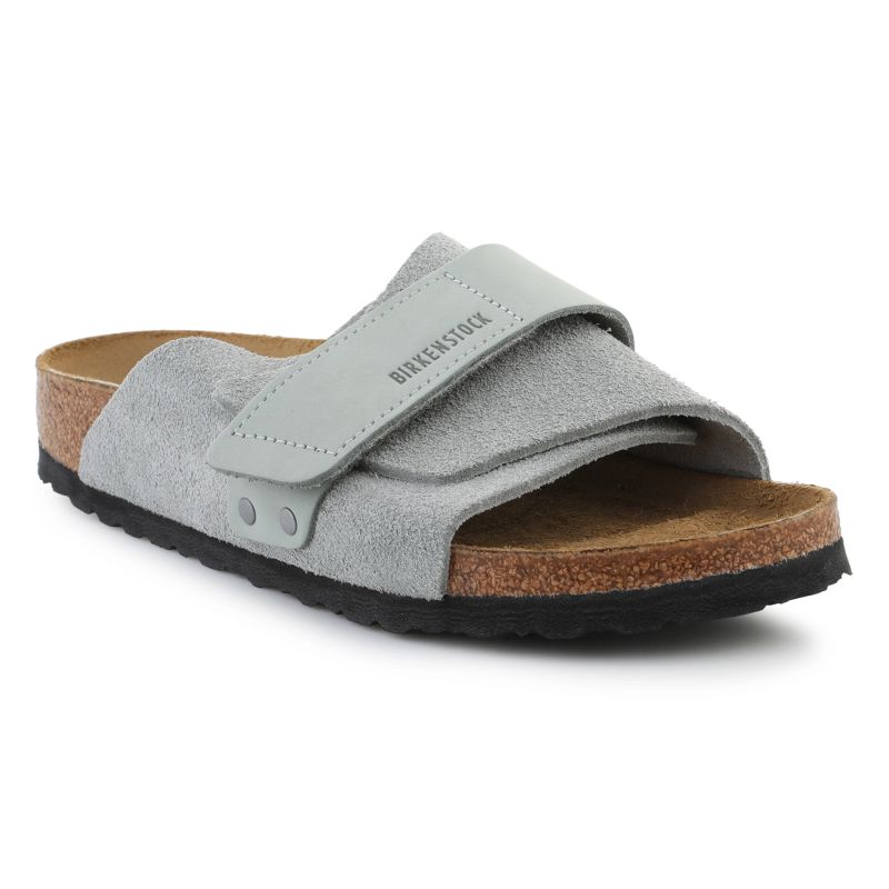 Birkenstock Kyoto 1031730 w kolorze Pure Sage to nowoczesne klapki o minimalistycznym designie, inspirowane popularnym modelem Zürich. Cholewka wykonana jest z połączenia wysokiej jakości zamszu oraz nubuku, które są miękkie i przyjemne w dotyku, dzięki czemu dobrze dopasowują się do stopy. Charakterystyczny szeroki pasek z regulacją na rzep umożliwia łatwe i szybkie dopasowanie obuwia.