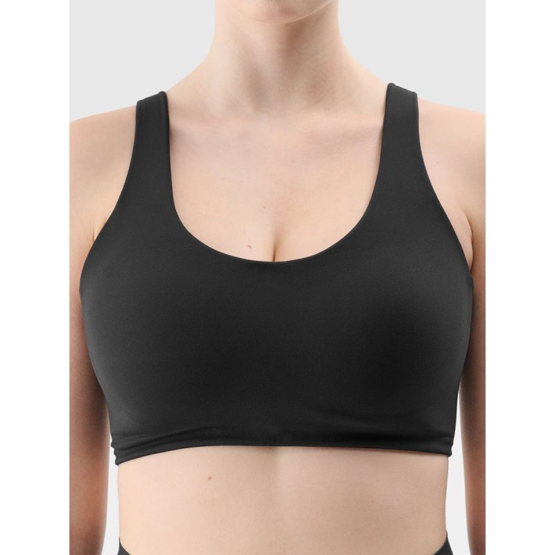Stanik treningowy ze średnim wsparciem został zaprojektowany z myślą o treningach o średniej intensywności, takich jak jogging, cardio czy jazda na rowerze. Dopasowany krój slim przylega do ciała, zapewniając stabilizację i swobodę ruchów, a bezszwowa konstrukcja minimalizuje ryzyko otarć i podrażnień skóry. Wykonany z wytrzymałej, a jednocześnie miękkiej dzianiny interlock o gładkiej strukturze po obu stronach, dobrze układa się na sylwetce i skutecznie chłonie wilgoć. Szybkoschnące włókna w technologii 4FDry wspierają odprowadzanie potu z dala od ciała, pomagając zachować komfort nawet podczas intensywniejszego wysiłku. Półusztywniane, formowane miseczki są zintegrowane z konstrukcją biustonosza, zapewniając stabilne podtrzymanie bez konieczności dodatkowych regulacji. Elastyczna guma pod biustem oraz szerokie ramiączka bez regulacji zwiększają komfort i pewność ruchu, a laserowo cięte brzegi z tyłu podnoszą estetykę i wygodę noszenia.