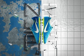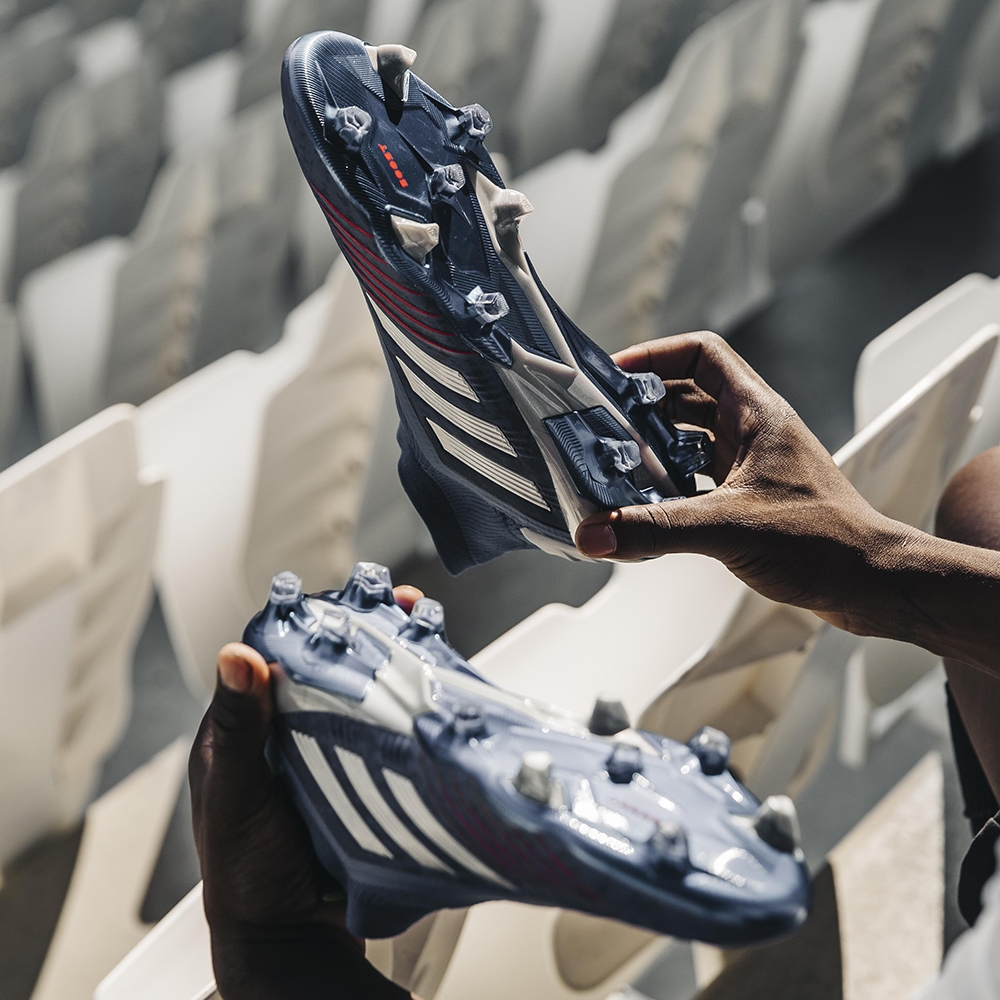 Zacznijmy od najbardziej kultowych korków, czyli modelu adidas Predator, który w kolekcji Exhibit przybrał niebieski, wręcz granatowy kolor ze srebrnymi i czerwonymi wstawkami. Dzięki cholewce Controlskin piłka wręcz klei nam się do stopy. Gładko przylegająca do stopy, niesznurowana przednia cześć buta zbudowana w technologii Purecut oferuje maksymalną kontrolę nad piłką. Z kolei cholewka adidas Primeknit outla całą stopę, gwarantując jej wsparcie i zwiększając dynamikę całego ciała. Technologia Boost gwarantuje sprężystą amortyzację, zaś rama Controlframe zapewnia najwyższą stabilizację, nawet przy najszybszych ruchach.