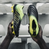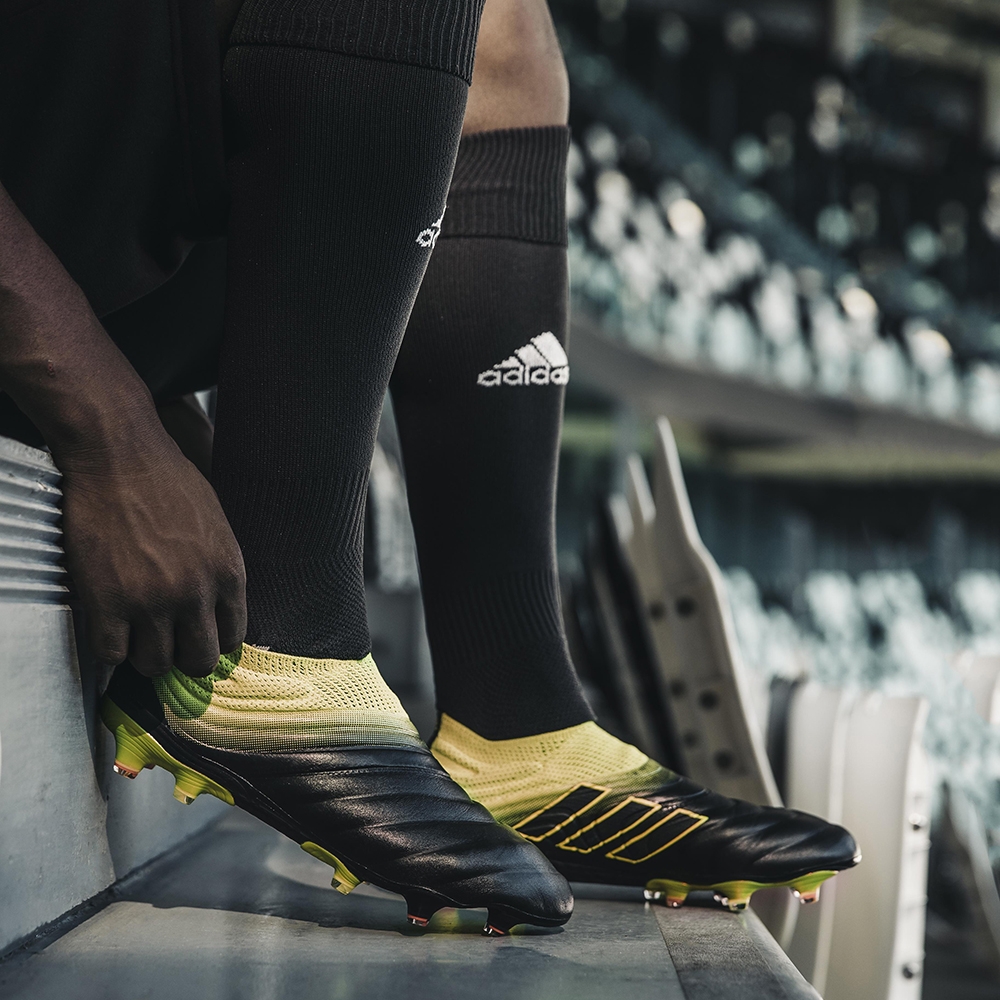 Przejdźmy do kolejnego kultowego modelu - COPA. W kolekcji Exhibit Pack buty COPA zaprojektowano w czarnej kolorystyce z żółtymi wstawkami. Nowe barwy mają łączyć tradycję z nowoczesnością. Buty COPA mają długoletnią tradycję wśród futbolowych purystów. COPA to klasyka dla zawodników, którzy cenią sobie kontrolę, kontakt z piłką i wygląd. W najnowszej odsłonie nie zabrakło oczywiście najnowszych innowacji, zaprojektowanych w celu osiągnięcia jak najlepszego dopasowania, czucia piłki i poruszania się. Kołnierz SOCKFIT została zaprojektowana tak, aby naturalnie rozszerzać się względem kształtu stopy, co zapewnia najbardziej optymalne dopasowanie obuwia. Innowacyjne wykończenie skóry Fusionskin zapewnia bezszwową konstrukcję i redukuje ilość wody pobieranej z boiska. Buty COPA zostały wyposażonę w technologię Purecut, pozbawioną krawędzi, nakładek i sznurowadeł, które mogłyby utrudnić wyczucie piłki. Zintegrowana przyszwa X-Ray zapewnia lepszą kontrolę i ogranicza poślizg piłki.