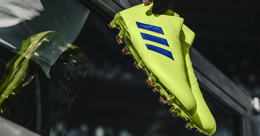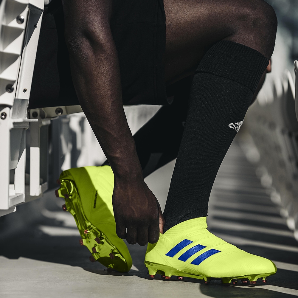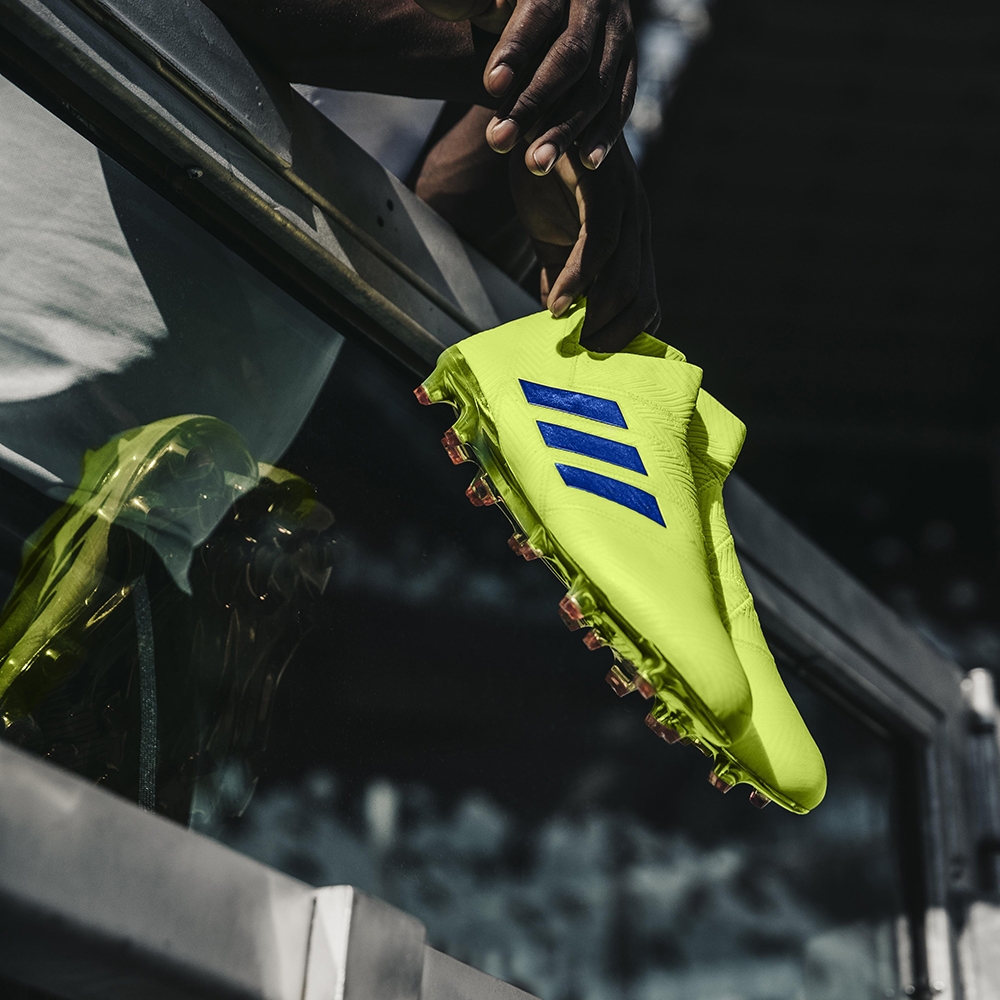 Model Nemeziz został stworzony dla najzwinniejszych zawodników. W odsłonie z serii Exhibit Pack Nemeziz przybierają w całości jaskrawo-żółtą barwę z niebieskimi paskami. Inspirowana taśmą sportową konstrukcja Agility Bandage zapewnia wsparcie i pełną mobilność niezbędną przy dynamicznym stylu gry. Konstrukcja bez sznurowadeł daje zwinnemu i kreatywnemu zawodnikowi to, co najlepsze: kompresję i swobodę ruchu dla mobilności, które rozstrzyga o wyniku meczu. Przednia część stopy Agility Weave zapewnia bezpośredni kontakt z piłką, natomiast lekka podeszwa zewnętrzna Torsionframe i Torsion Ribs zapewnia odbicie od podłoża
