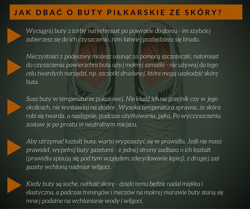 Buty piłkarskie ze skóry wymagają profesjonalnej opieki. Większość osób dba np. o obuwie codziennie, tymczasem buty piłkarskie wymagają dużo większej dbałości - są bowiem eksploatowane znacznie intensywniej.