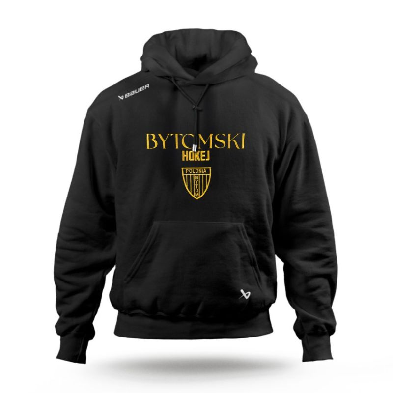 Bluza Bytomski Hokej -Haft Styl, duma i komfort dla fanów Polonii Bytom Bluza Bytomski Hokej to obowiązkowy element garderoby każdego kibica klubu hokejowego Polonii Bytom! Klasyczna czarna bluza z kapturem łączy sportowy charakter z codziennym komfortem. Z przodu znajduje się efektowny haft „BYTOMSKI HOKEJ” w złotym kolorze oraz herb klubu Polonia Bytom – symbol dumy i tradycji bytomskiego hokeja. Główne cechy: Wysokiej jakości materiał: Wykonana z miękkiej mieszanki 65% poliestru i 35% bawełny – idealna na chłodne dni, zarówno na trybunach, jak i poza nimi. Sportowy design Bauer: Nowoczesny krój i stylowe logo producenta na ramieniu. Efektowny haft klubowy: Napis „BYTOMSKI HOKEJ” i herb Polonii Bytom w kontrastującym złotym kolorze. Funkcjonalny kaptur i kieszeń kangurka: Idealne rozwiązanie na chłodniejsze dni. Uniwersalny styl: Swietnie sprawdzi się zarówno na trybunach, jak i w codziennym użytkowaniu. Bluza Bytomski Hokej - Haft to połączenie sportowej elegancji i klubowej pasji – idealna dla każdego fana, który chce dumnie reprezentować barwy Polonii Bytom!