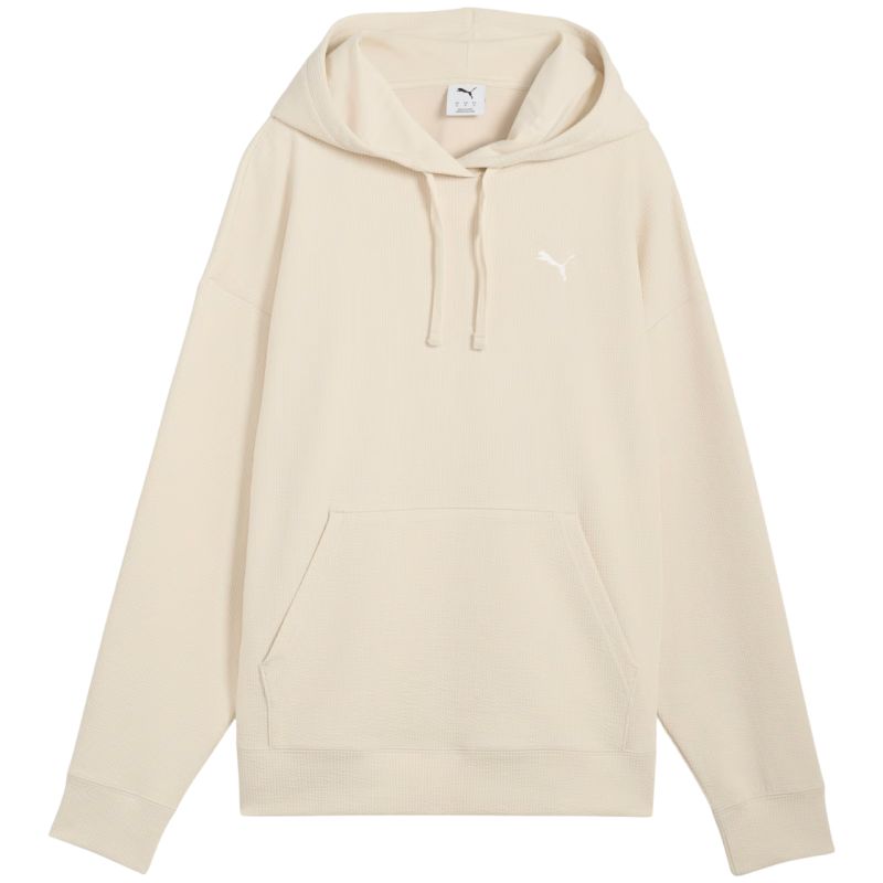 Bluza damska Puma ESS Elevated Comfort Hoodie kremowa 691814 87 Bluza dla kobiet Puma sprawdzi się podczas codziennego użytkowania. Niewielkie logo na froncie. Luźny krój. Ściągacze w mankietach i u dołu. Frontowa kieszeń. Regulowany kaptur. Materiał główny: 61% bawełna, 34% poliester, 5% elastan