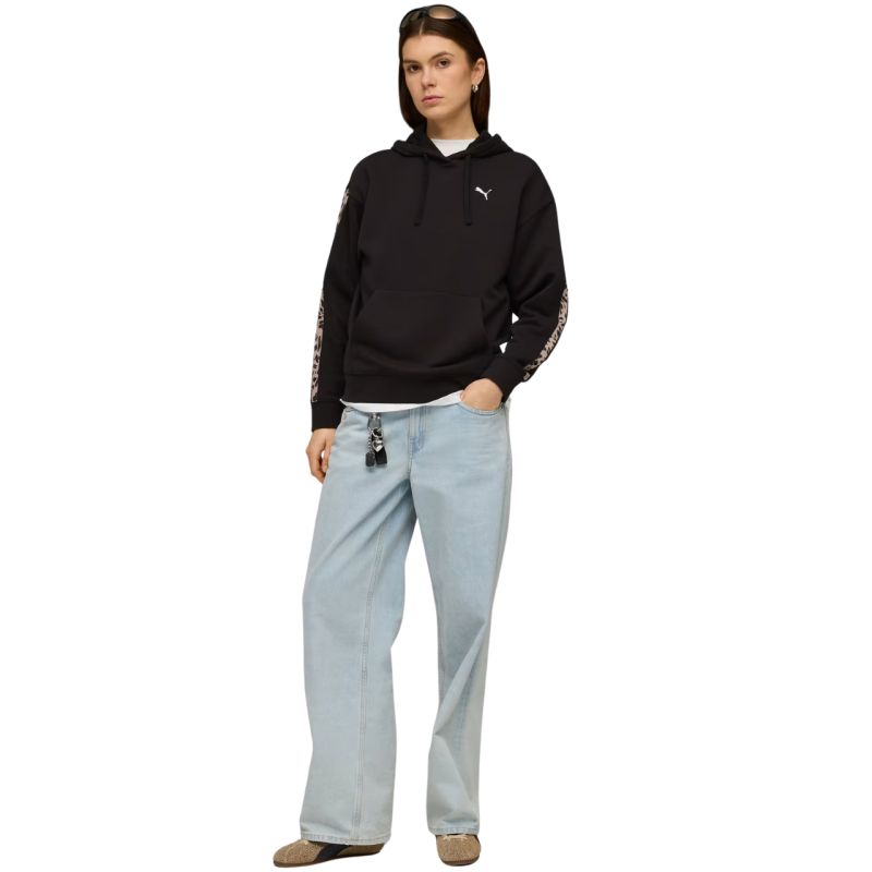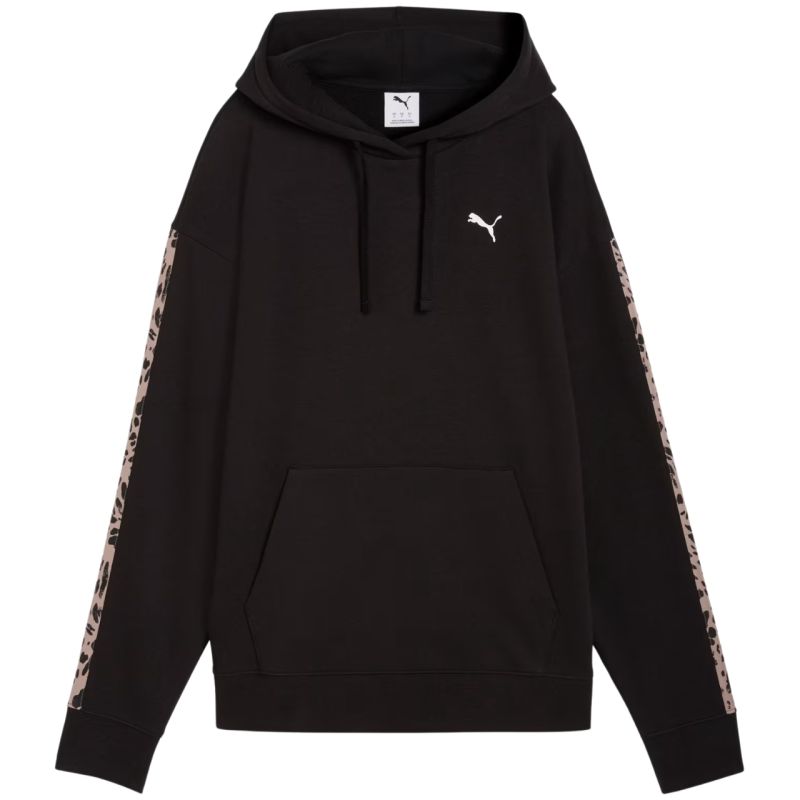 Bluza damska Puma ESS Graphic Animal Comfort Hoodie czarna 691822 01 Bluza dla kobiet Puma sprawdzi się podczas codziennego użytkowania. Niewielkie logo na froncie. Luźny krój. Ściągacze w mankietach i u dołu. Frontowa kieszeń. Regulowany kaptur. Lampasy ze zwierzęcym motywem. Dane techniczne:· Materiał główny: 68% bawełna, 32% poliester· Ściągacze: 97% bawełna, 3% elastan· Podszewka kaptura: 100% bawełna