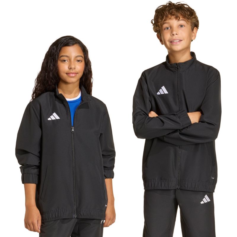 Bluza dla dzieci adidas Entrada 26 Presentation czarna JZ6614 Bluza dla dzieci adidas będzie sprawdzonym modelem podczas rozgrzewki, regeneracji po treningu czy chwili na ławce rezerwowych. Standardowy krój. Zamek na całej długości. Stójka. Sportowy fason z elastycznymi mankietami i dołem. Technologia Climacool odprowadza i rozprasza pot, zapewniając chłód, suchość. Zapinane kieszenie boczne. Materiał: 100% poliester z recyklingu