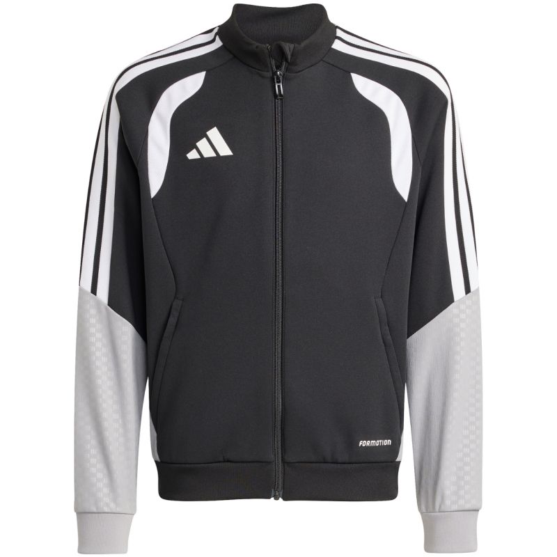 Bluza dla dzieci adidas Tiro 26 Competition Training czarna KA7711 Bluza piłkarska adidas przeznaczona dla dzieci sprawdzi się podczas treningów. Stójka. Długi zamek wykończono patką chroniącą podbródek. Dopasowany krój. Technologia Formotion zadba o jeszcze lepszą mobilność. Siateczkowe panele umieszczone na klatce piersiowej. Paski w górnej części rękawów. Mankiety wykończone elastycznymi ściągaczami. Wytłoczone elementy na ramionach i bokach. Materiał: 100% poliester z recyklingu