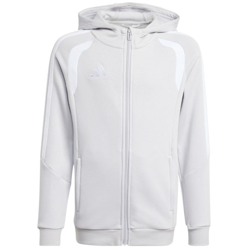 Bluza dla dzieci adidas Tiro 26 League Sweat Full Zip Hoodie szara KF3323 Bluza piłkarska dla dzieci adidas Tiro to obowiązkowy element garderoby każdego, młodego piłkarza. Miękka w dotyku konstrukcja będąca połączeniem oddychającej bawełny i trwałego poliestru nie powoduje podrażnień na skórze. Klasyczny krój pozwala zachować pełen zakres ruchów. Zamek na całej długości. zapinane kieszenie boczne. Zintegrowany kaptur bez regulacji chroniący głowę przed niekorzystnymi warunkami atmosferycznymi. Ściągacze przy mankietach oraz u dołu bluzy. Wyszywane logo producenta. Materiał: 70% bawełna, 30% poliester pochodzący z recyklingu
