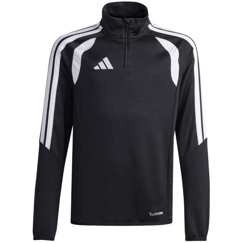 Bluza dla dzieci adidas Tiro 26 League Training Top czarno-biała JY7161 Bluza piłkarska adidas przeznaczona dla dzieci sprawdzi się podczas treningów.. Wykończony patką chroniącą podbródek, krótki zamek. Dopasowany krój. Technologia Climacool jest funkcjonalnym rozwiązaniem, które zapewnia uczucie chłodu i suchości oraz skupienie na grze. Dół oraz mankiety wykończono elastyczną lamówką. Kontrastowe, siateczkowe wstawki. Paski na rękawach. Subtelne logo na piersi. Materiał: 100% poliester z recyklingu