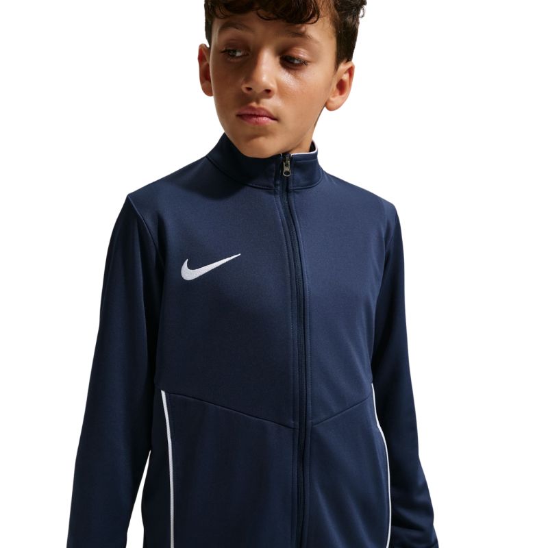 Bluza dla dzieci Nike Dri-Fit Park 26 granatowa HM7256 410 Juniorska bluza Nike jest doskonałym wyborem na różne aktywności Twojego dziecka w chłodniejsze dni. Sportowy fason został wyeksponowany przez kontrastowe lamówki, które są subtelnym akcentem, dopełniającym bluzę. Oddychający materiał z technologią Dri-FIT. Regularny krój. Stójka. Boczne kieszenie. Długi suwak. Materiał: 100% poliester