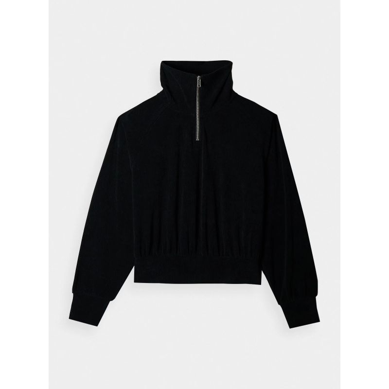 Bluza dresowa nierozpinana dla kobiety jest wykonana z weluru o delikatnym połysku. Welur wyróżnia się miękką, delikatną w dotyku powierzchnią. Ponadto zapewnia wysoką elastyczność i sprężystość oraz bardzo dobrze układa się na ciele. Dzięki dodatkowi elastanu (5%) jest rozciągliwa i wygodnie układa się na sylwetce.Stójka pod szyją zapinana na zamek. Mankiety i dół ze ściągaczem. Klasyczny fason bez kieszeni. Wkładana przez głowę. Raglanowe rękawy nie ograniczają ruchów.