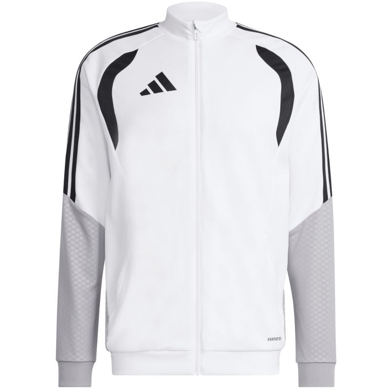 Bluza męska adidas Tiro 26 Competition Training biała KA7682 Bluza piłkarska adidas przeznaczona dla mężczyzn sprawdzi się podczas treningów. Stójka. Długi zamek wykończony patką ochroną. Dopasowany krój. Technologia Formotion zadba o bardzo dobrą mobilność. Siateczkowe wstawki na klatce piersiowej. Paski na ramionach. Subtelne logo na piersi. Wytłoczenia na rękawach i bokach. Szybkoschnące włókna. Materiał: 100% poliester z recyklingu