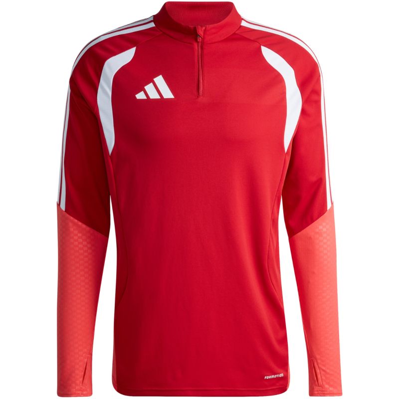 Bluza męska adidas Tiro 26 Competition Training Top czerwona KA7559 Bluza piłkarska adidas przeznaczona dla mężczyzn sprawdzi się podczas treningów. Stójka. Krótki zamek wykończony patką ochroną. Dopasowany krój. Technologia Formotion zadba o bardzo dobrą mobilność. Siateczkowe wstawki na klatce piersiowej. Paski na ramionach. Subtelne logo na piersi. Wytłoczenia na rękawach i bokach. Szybkoschnące włókna. Rękawy wykończone otworami na kciuki. Materiał: 100% poliester z recyklingu