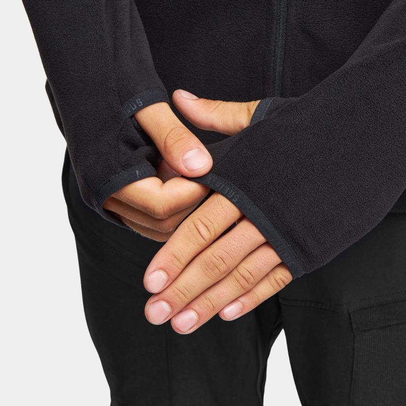 - Wysoka stójka zapinana na krótki zamek błyskawiczny chroni szyję przed chłodem i wiatrem. Odpowiednie dopasowanie do ciała umożliwiają ściągacze na biodrach. Przedłużona część pleców zabezpiecza przed podwiewaniem, dobrze utrzymując ciepło.