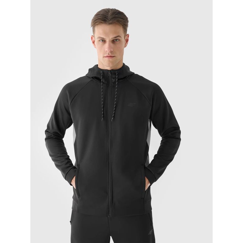 Bluza do ćwiczeń rozpinana dla mężczyzny jest wykonana z materiału syntetycznego, który zapewnia trwałość i jest łatwy w pielęgnacji. Dzięki dodatkowi elastanu (5%) jest rozciągliwa i wygodnie układa się na sylwetce. Wykorzystane szybkoschnące włókna w technologii 4FDry wspierają odprowadzanie wilgoci z dala od ciała. Zintegrowany kaptur przy dekolcie z regulacją na troki. Mankiety z dzianiny zasadniczej. Po bokach znajdują się 2 kieszenie zapinane na zamek. Bluza jest zapinana na jednokierunkowy zamek główny. Raglanowe rękawy nie ograniczają ruchów.