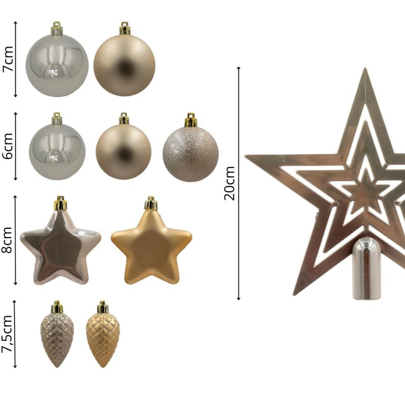 - W zestawie: - czubek gwiazda - 1szt, bombka/szyszka - 5szt/7,5cm, bombka o średnicy 6cm- 17szt., bombka o średnicy 8cm - 8szt., bombka o średnicy 7 cm - 9 szt., bombka gwiazdka o średnicy 8 cm -8szt.