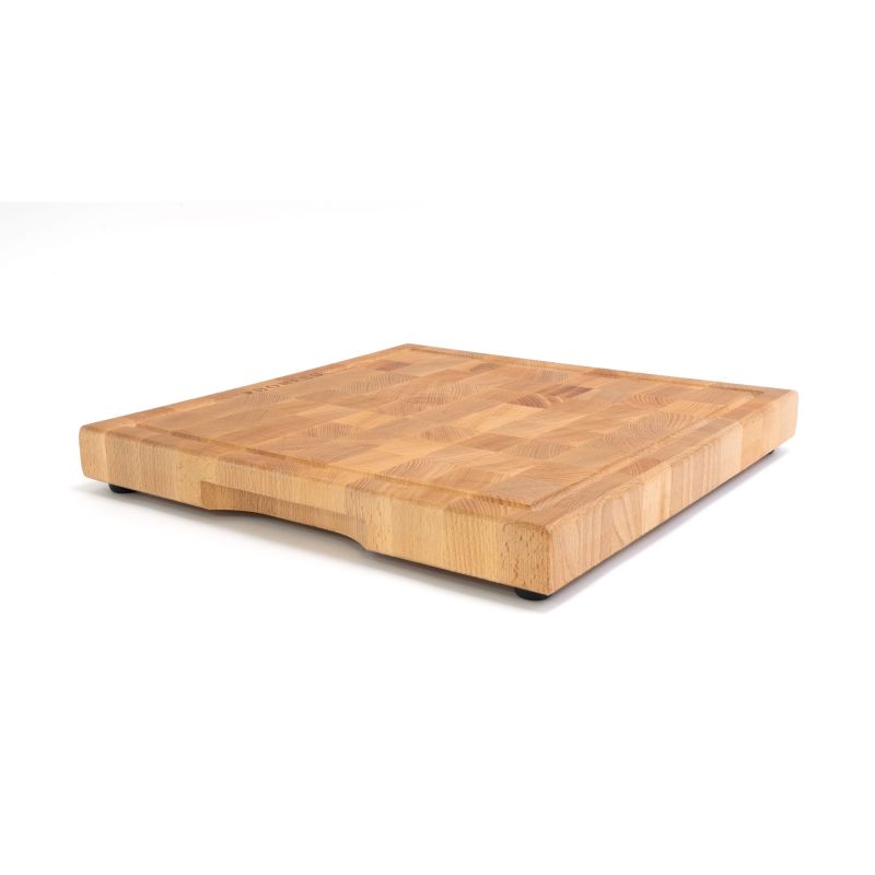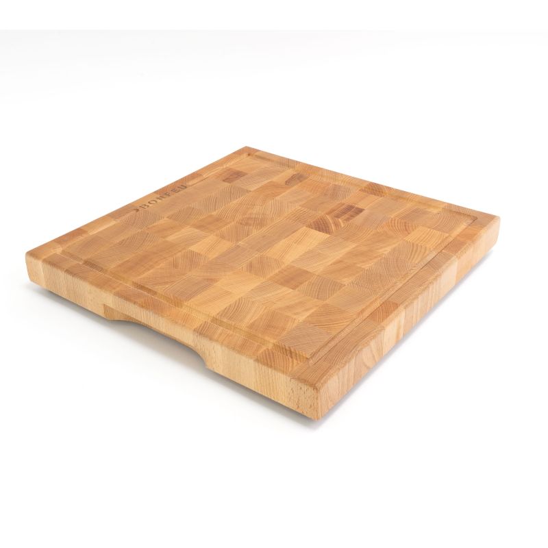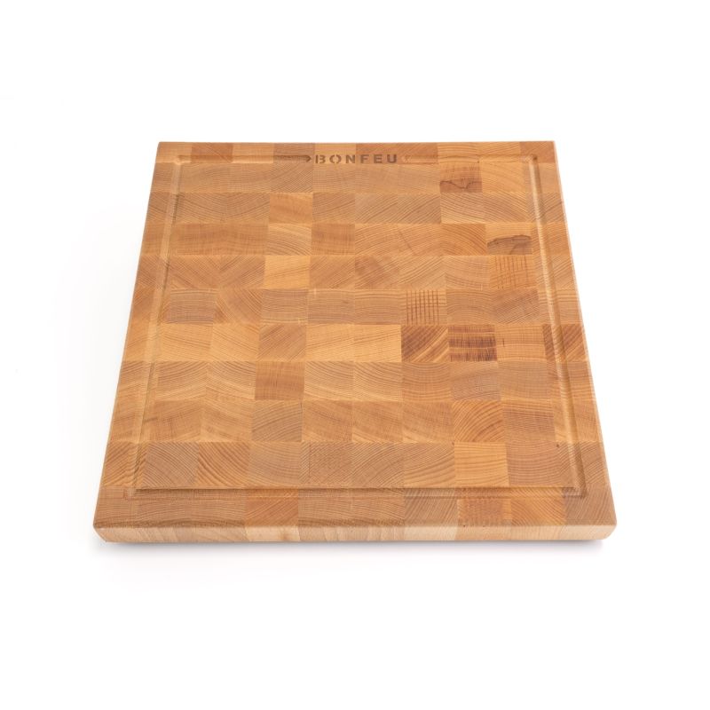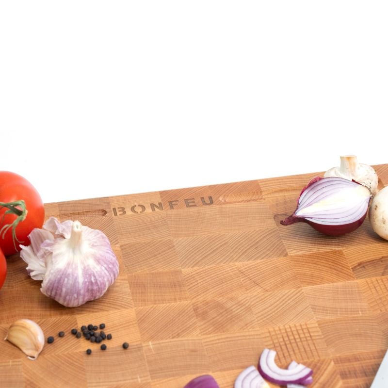 Deska do krojenia blok rzeźniczy BonButcher marki BonFeu to masywna i solidna deska do krojenia wykonana z bukowego drewna ciętego poprzecznie. Taki sposób obróbki sprawia, że powierzchnia robocza jest wyjątkowo odporna na uszkodzenia mechaniczne i intensywne użytkowanie. Jednocześnie deska zachowuje naturalną miękkość podczas krojenia, dzięki czemu noże dłużej pozostają ostre. Naturalna struktura drewna w połączeniu z eleganckim wykończeniem sprawia, że deska doskonale sprawdzi się zarówno podczas przygotowywania potraw, jak i przy ich serwowaniu w ogrodzie lub w kuchni. Produkt został dwukrotnie zaolejowany, dzięki czemu jest lepiej chroniony przed wilgocią i łatwy w utrzymaniu.