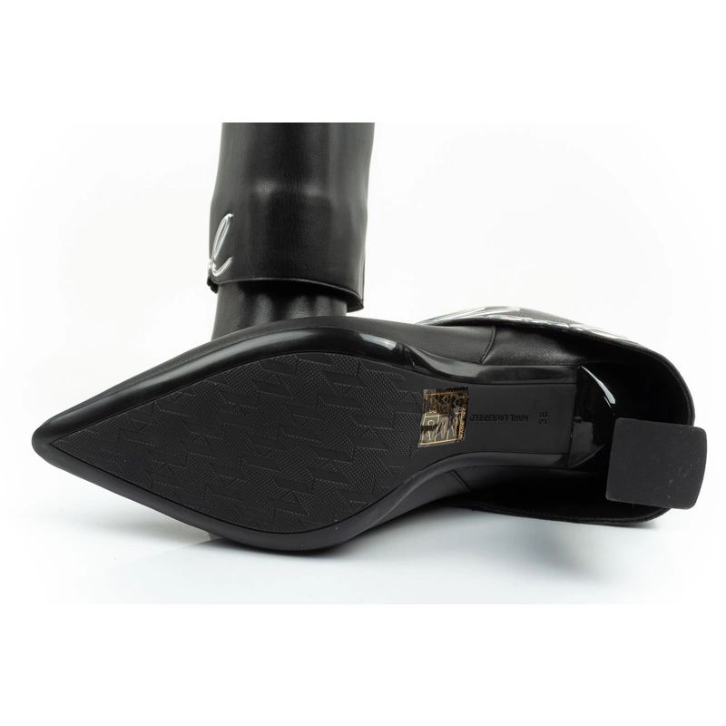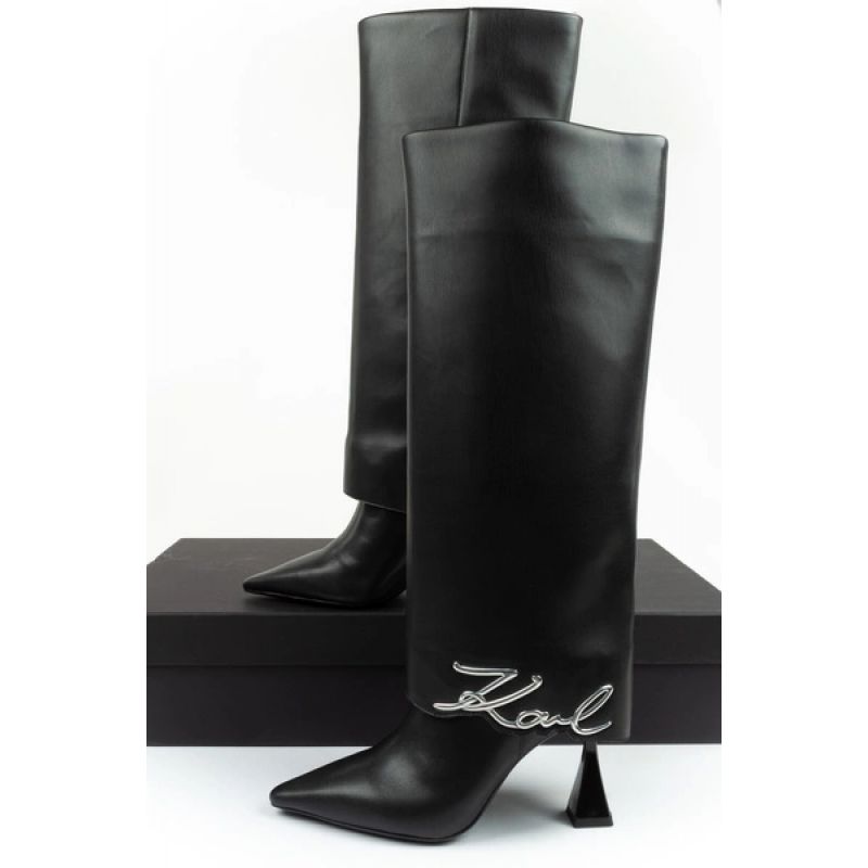 - Wykonane z miękkiej, naturalnej skóry w klasycznym odcieniu czerni, te eleganckie kozaki wyróżniają się nowoczesną formą oraz efektownym, metalowym logotypem "Karl" umieszczonym przy kostce