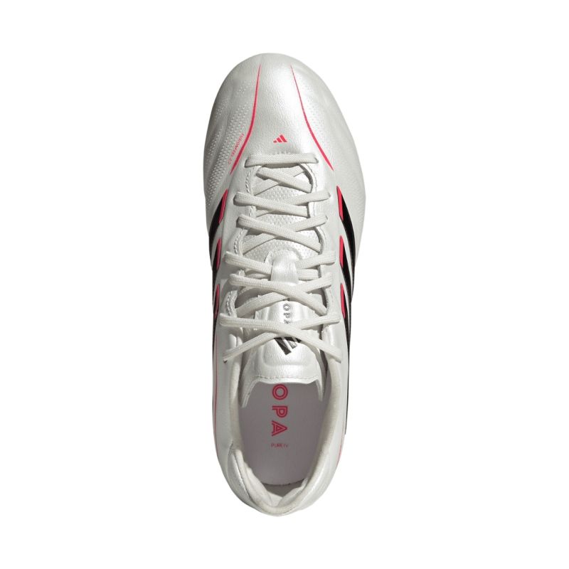 Buty piłkarskie dla dzieci adidas Copa Pure IV Elite FG JR4406 Profesjonalne buty piłkarskie dla dzieci adidas sprawdzą się w trakcie meczów rozgrywanych na naturalnej, twardej nawierzchni. Projekt butów opiera się na technologii Fusionskin czyli mniej przepuszczalnej powłoce na cholewce. Konstrukcja języka Primeknit oferuje regulację i blokadę, aby wspierać komfort, a amortyzowana wkładka pomaga uzyskać anatomiczne dopasowanie. Sznurowanie stabilizuje całość. Specjalne rozłożenie kołków w podeszwie zapewnia odpowiedni rozkład siły nacisku. Podeszwa z dopracowaną konstrukcją kołków dba o niezawodną przyczepność. Buty z kolekcji Born For Goals Pack. Dane techniczne: · Standardowe dopasowanie· Sznurowadła· Syntetyczna wkładka· Syntetyczna podeszwa zewnętrzna· Technologia Fusionskin