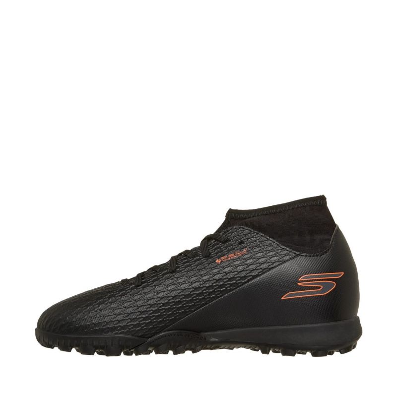 Buty piłkarskie dla dzieci Skechers SKX_2 czarno-pomarańczowe 252166L Buty piłkarskie dla chłopców Skechers przeznaczone są do gry na nawierzchniach ze sztuczną trawą. Cholewka ze skóry syntetycznej o podwyższonym profilu. Kołnierz z tekstylnej tkaniny Performance Textile Cuff zadba o lepszą stabilizację w trakcie ruchu. Klasyczne sznurowanie. Teksturowana powłoka. Tekstylne wnętrze oraz wkładka EVA. Gumowa podeszwa zewnętrzna.