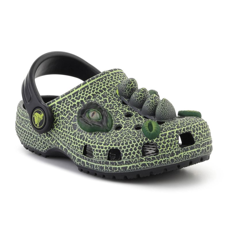 Crocs Classic I Am Scary Dino Clog T Kids Black 211372-001 to dziecięce klapki stworzone z myślą o małych fanach dinozaurów. Model przyciąga uwagę efektownym wyglądem inspirowanym prehistorycznym gadem — cholewka ma fakturę przypominającą dinozaurowe łuski, a całość uzupełniają stałe detale w formie oczu, nozdrzy i kolców. Dzięki temu buty wyróżniają się oryginalnym stylem i pomagają dziecku wyrazić zainteresowania podczas codziennych zabaw. To wygodne klapki dziecięce na co dzień, do domu, przedszkola, ogrodu i na wyjazdy. Model został wyposażony w ruchomy pasek na pięcie, który poprawia dopasowanie i pomaga utrzymać stopę na miejscu. Za komfort odpowiada technologia Iconic Crocs Comfort™, czyli konstrukcja lekka, elastyczna i zapewniająca wygodę w zakresie 360 stopni. Crocs Classic I Am Scary Dino Clog to lekkie buty dziecięce o zabawnym, wyrazistym designie, które łączą charakterystyczny wygląd z wygodą znaną z modeli Classic.