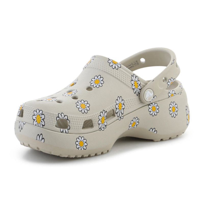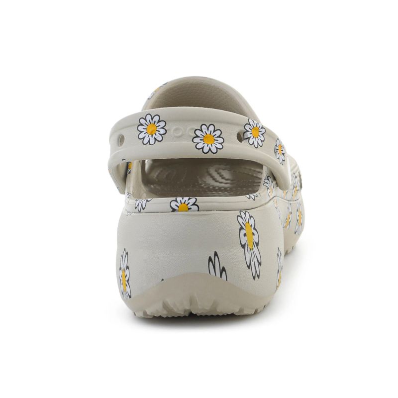But wykorzystuje tę samą cholewkę co klasyczny Classic Clog, dzięki czemu oferuje sprawdzony fason i komfort noszenia. Konstrukcja została oparta na technologii Iconic Crocs Comfort™, która zapewnia lekkość, elastyczność i komfort 360 stopni. Dodatkowym atutem jest możliwość personalizacji – otwory w cholewce oraz regulowany pasek na pięcie pozwalają ozdobić model przypinkami Jibbitz™. Crocs Classic Platform Floral Clog to świetny wybór na co dzień, na lato, na wyjazdy i do miejskich stylizacji, gdy liczy się wygoda, lekkość i efektowny, kwiatowy design.
