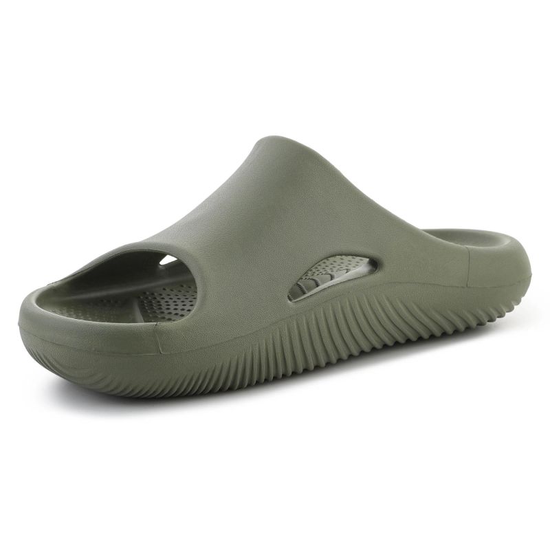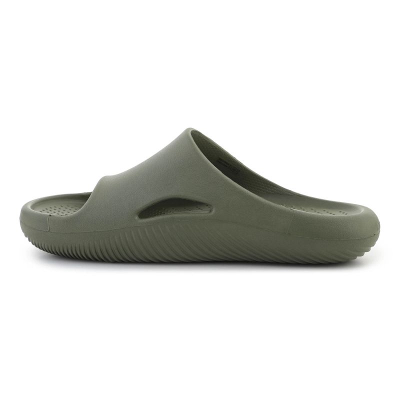 Crocs Mellow Recovery Slide Army Green 208392-309 to model stworzony z myślą o odpoczynku i codziennym komforcie. Te wsuwane klapki wyróżniają się prostą, nowoczesną sylwetką oraz stonowanym kolorem Army Green, który podkreśla ich minimalistyczny charakter. Szeroki pasek i płynne linie cholewki nadają całości współczesny wygląd, a otwory w górnej części wspierają przewiewność.