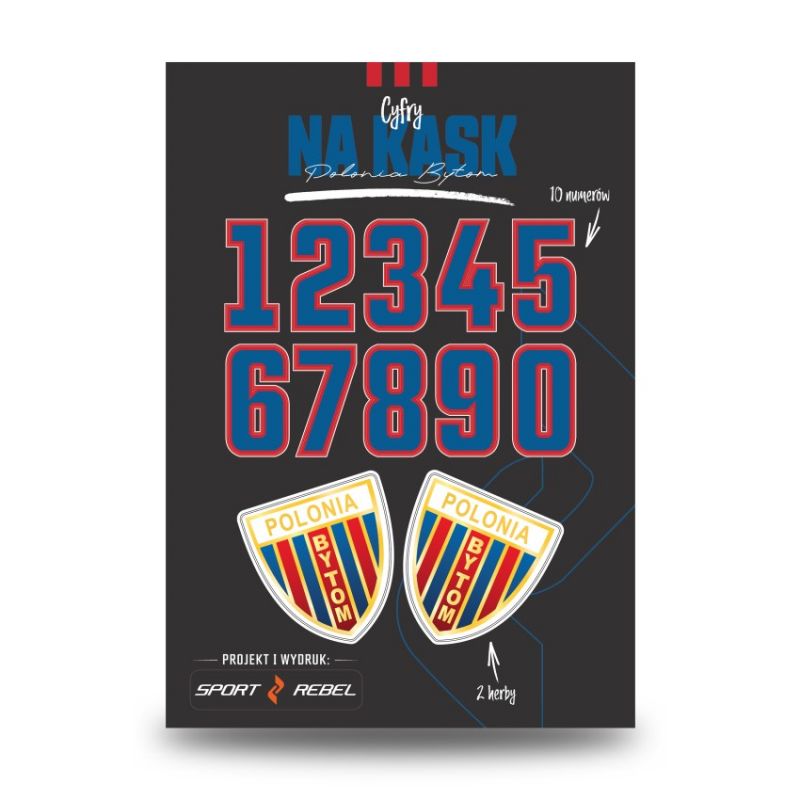 Cyfry na kask Polonia Bytom Cyfry na kask Polonia Bytom to zestaw wysokiej jakości naklejek stworzonych z myślą o hokeistach i kibicach chcących spersonalizować swój sprzęt w barwach ukochanego klubu. Główne cechy: Oficjalny design: Komplet zawiera cyfry od 0 do 9 w klubowych barwach z wyrazistym konturem. Wysoka jakość druku: Naklejki są odporne na wilgoć i ścieranie, dzięki czemu świetnie sprawdzają się podczas meczów i treningów. Dodatkowe herby: Zestaw uzupełniają 2 naklejki z oficjalnym herbem klubu Polonia Bytom – idealne na kask lub inny sprzęt. Cyfry na kask Polonia Bytom to idealny sposób, by pokazać swoją przynależność klubową na lodzie i poza nim!
