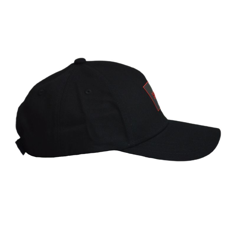 Czapka bawełniana w całości utrzymana w kolorzeczarnym z czerwonymi akcentami.