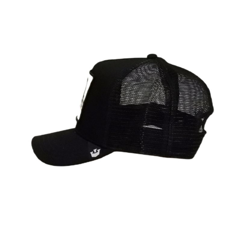 Czapka typu trucker wkolorzeczarnymz żakardową metką marki Goorin Bros na daszku.
