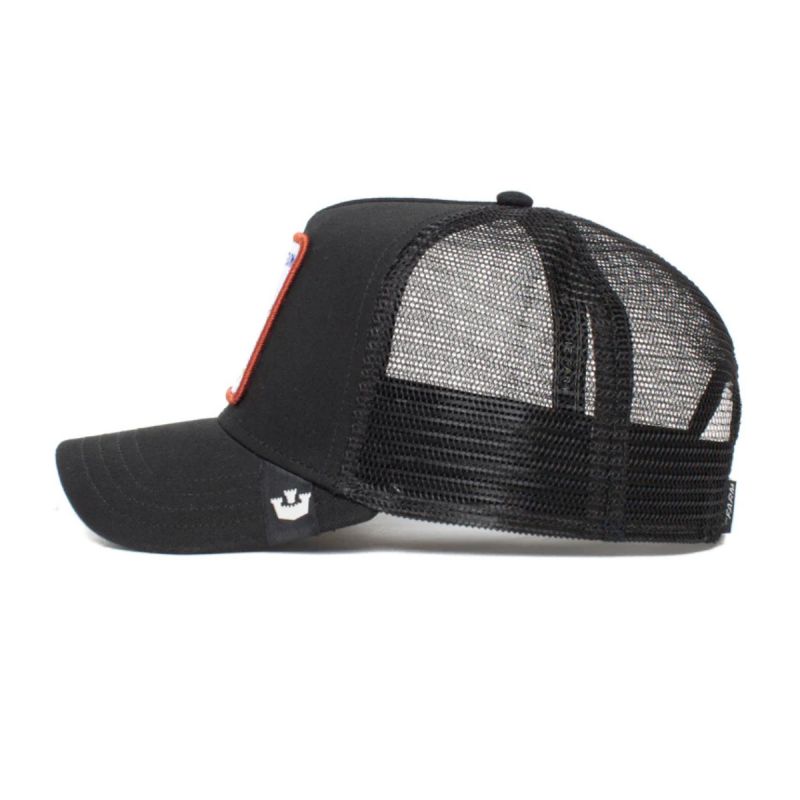 Czapka typu trucker w czarnej kolorystycez żakardową metką marki Goorin Bros na daszku.