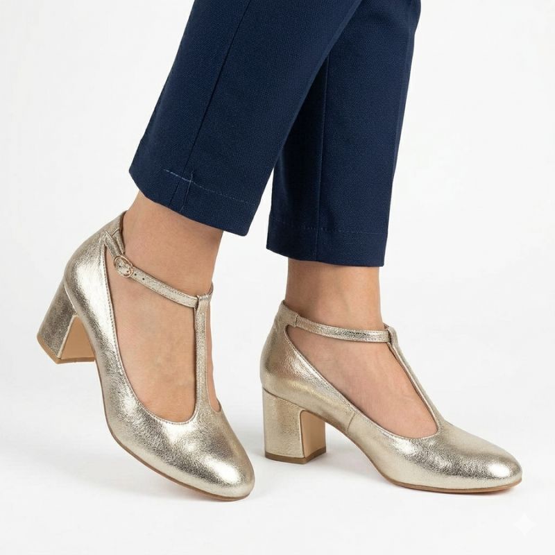 3. Czółenka na słupku błyszczące z paskiem złote Mascara 834283