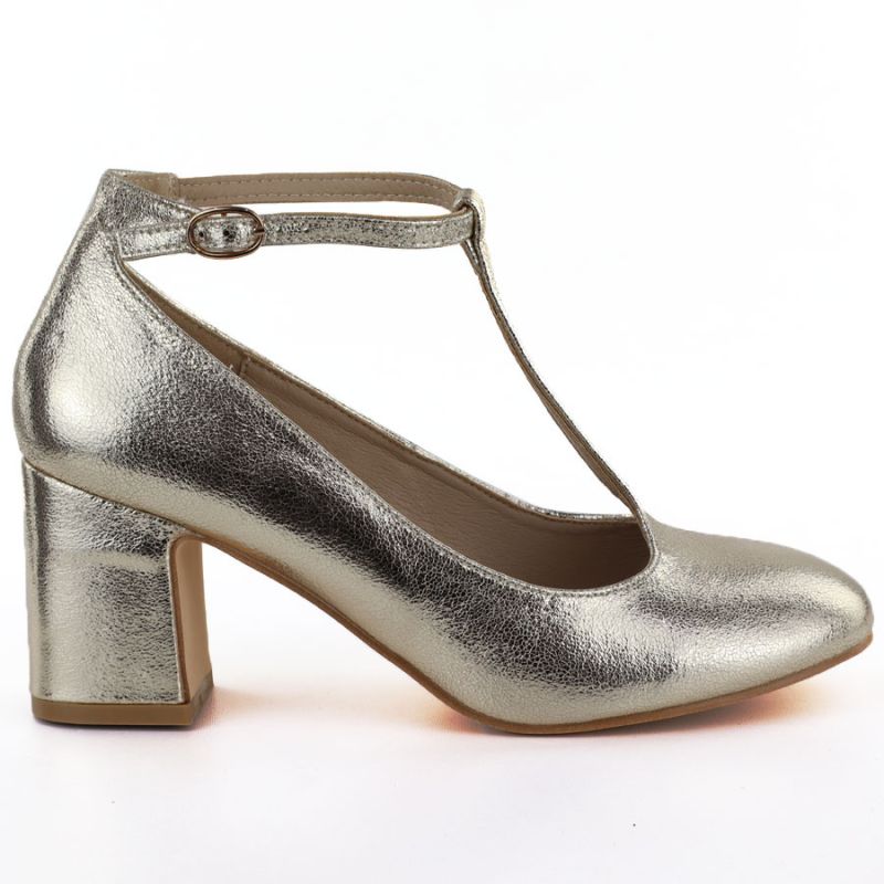 4. Czółenka na słupku błyszczące z paskiem złote Mascara 834283
