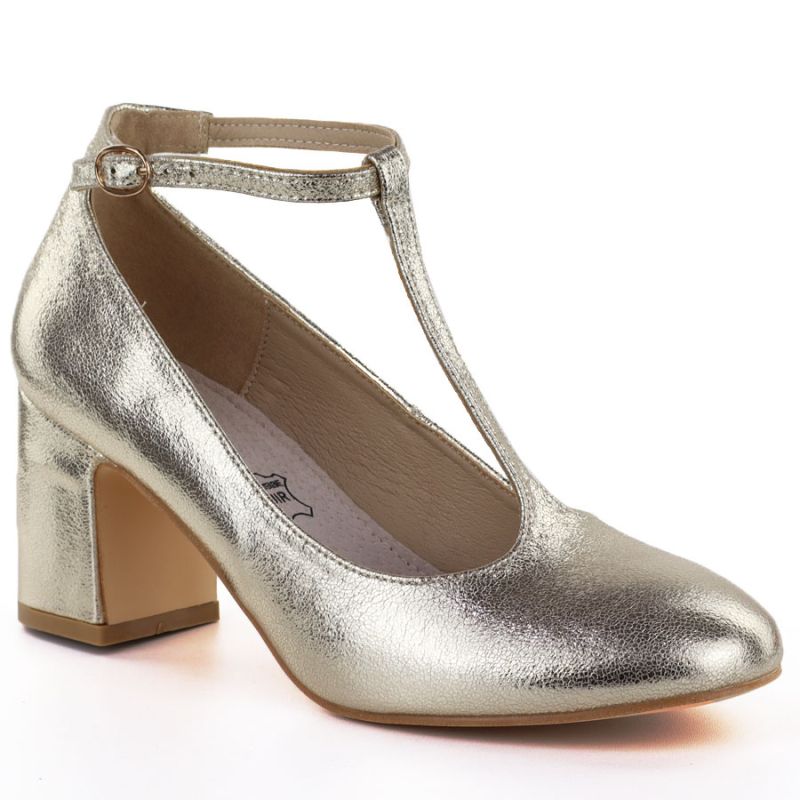 5. Czółenka na słupku błyszczące z paskiem złote Mascara 834283