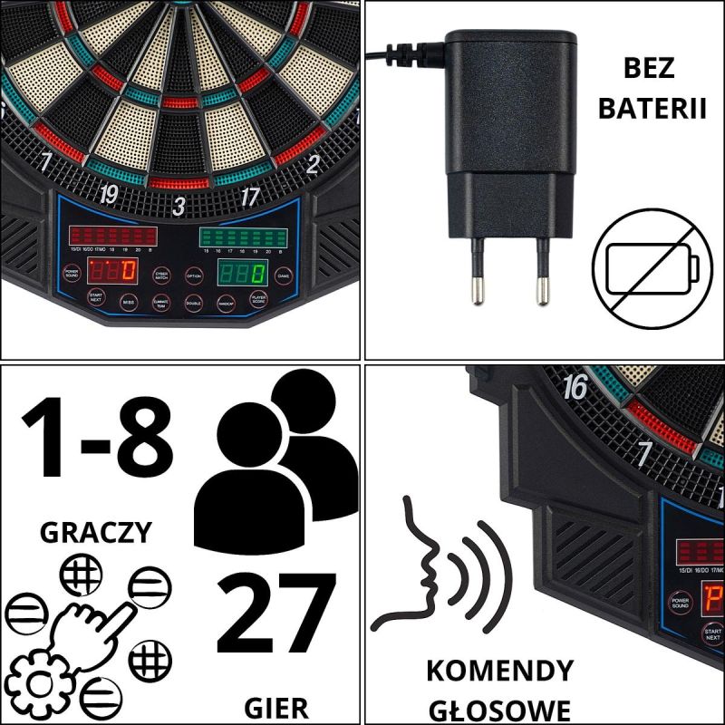 - Zestaw zawiera: zasilacz, tarcza, rzutki – 6 szt., wymienne końcówki 50szt. , instrukcja