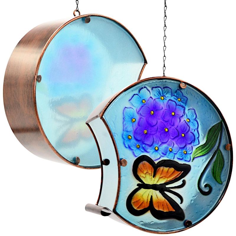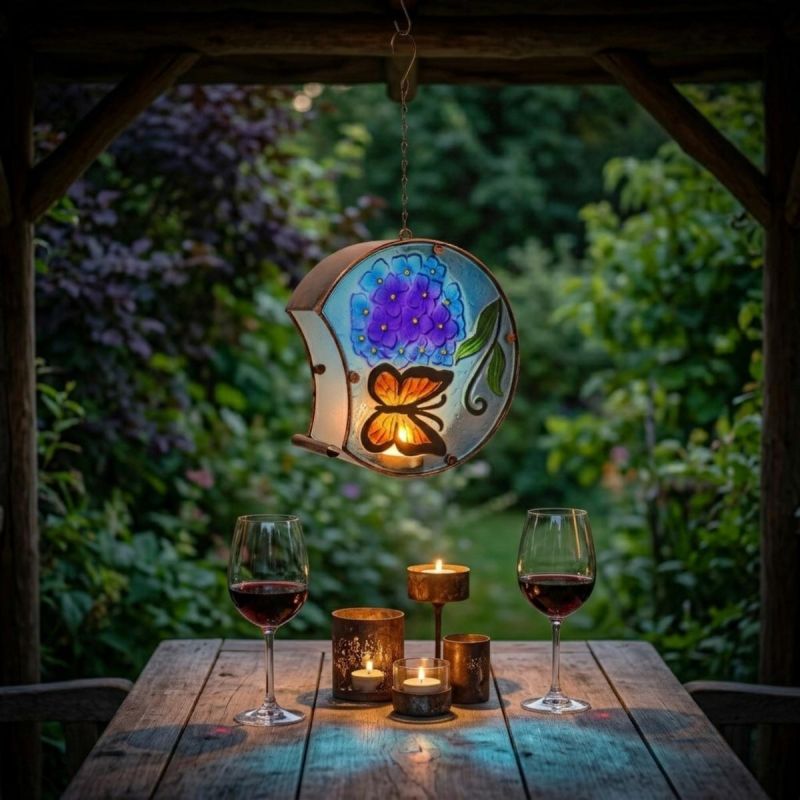 Udekoruj i oświetl swój dom lub ogród kolorowym witrażem ze świecą wewnątrz. Ozdobny lampion wiszący ze szkła i metalu, wygląda znakomicie w ogrodzie, w domu, na tarasie i balkonie.