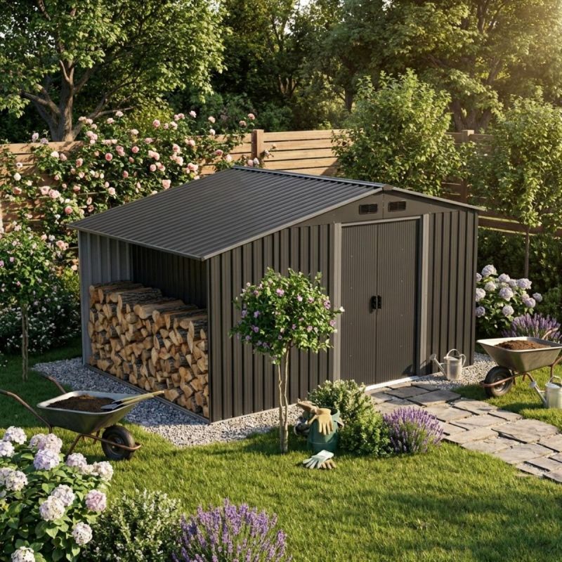 Ten model sprawdzi się idealnie, bo łączy dużą część narzędziową ze zintegrowaną drewutnią, a solidna stalowa konstrukcja gwarantuje trwałość i odporność na warunki atmosferyczne przez cały rok.