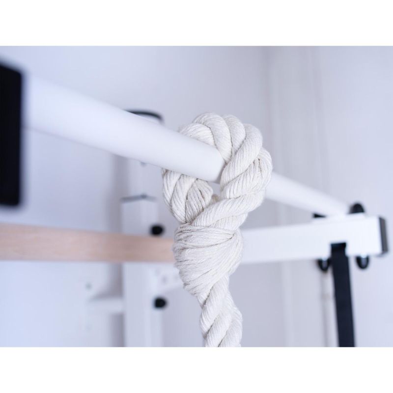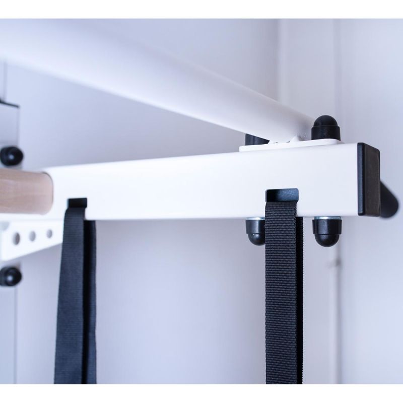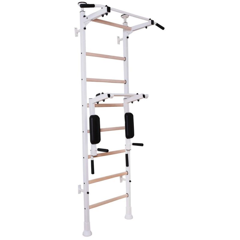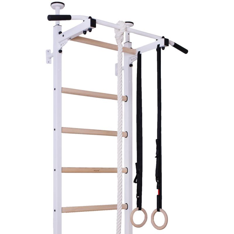 Drabinka gimnastyczna jest stabilną konstrukcją przeznaczoną dla dzieci w wieku szkolnym oraz dla ich rodziców. Biały kolor drabinki wraz ze szczebelkami z naturalnego drewna bukowego tworzy niepowtarzalny wygląd drabinki. Naturalna i stonowana kolorystyka drabinki sprawia, że sprzęt doskonale wkomponowuje się w aranżacje pokoju dziecka. Dodatkowym atutem jest opcja montażu rozporowego, która nie wymaga wiercenia w ścianie. Wielofunkcyjna drabinka gimnastyczna została wykonana z metalowych profili (50 mm x 40 mm) oraz drewnianych bukowych olejowanych ręcznie szczebelków. Jej atutem jest możliwość montowania rozporowego (bez wiercenia w ścianie). Jednolite pionowe profile boczne zostały pomalowane proszkowo na biało. Drabinka zaprojektowana została tak, aby nie tylko urozmaicić wystrój pokoju, ale stać się także jego niezbędnym dodatkiem. Zaletą drabinki jest także to, że praktycznie nie zajmuje miejsca w pokoju. Warto podkreślić, że drabinka jest bardzo trwała i przystosowana do dużych obciążeń. Maksymalna waga osoby ćwiczącej wynosi 150 kg. W skład zestawu oprócz drabinki wchodzi drążek do podciągania, kółka gimnastyczne oraz lina z huśtawką. Drabinka montowana jest do ściany lub rozporowo (podłoga-sufit).