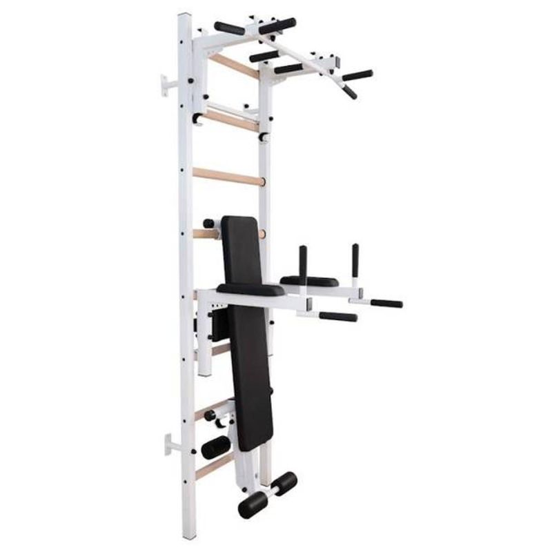 Drabinka gimnastyczna z regulowanym drążkiem, poręczą ora ławką to model, który idealnie pasuje do skandynawskiego stylu wnętrz. Pionowe profile (40mm x 50 mm) wykonane są z wysokiej jakości metalu pomalowanego proszkowo. Szczebelki są wykonane z buku o owalnym kształcie, powierzchnia szczebelków jestb olejowana ręcznie, to wszystko wpływa na to, że użytkowanie drabinki jest komfortowe. W górnej części drabinki znajduje się zdejmowany metalowy drążek do podciągania, który wyposażony jest w 6 różnych rączek pozwalających pracować nad siłą mięśni ramion i pleców za pomocą różnych chwytów, np. chwytem szerokim. Drabinka stworzona została z myślą o osobach, które chcą pracować nad swoją sylwetką w zaciszu swojego domu. Drabinka pozwala wykonywać wiele różnorodnych ćwiczeń, nie zajmując przy tym dużo miejsca. Design przemyślano tak, aby pasował do aktualnych trendów w aranżacji wnętrz, nie zaburzając ogólnego wystroju mieszkania. Jedna osoba dorosła może zmienić regulację wysokości drążka oraz zmienić pozycję. Jeżeli obrócimy drążek do podciągania, będzie on służył jako uchwyt pod sztangę.