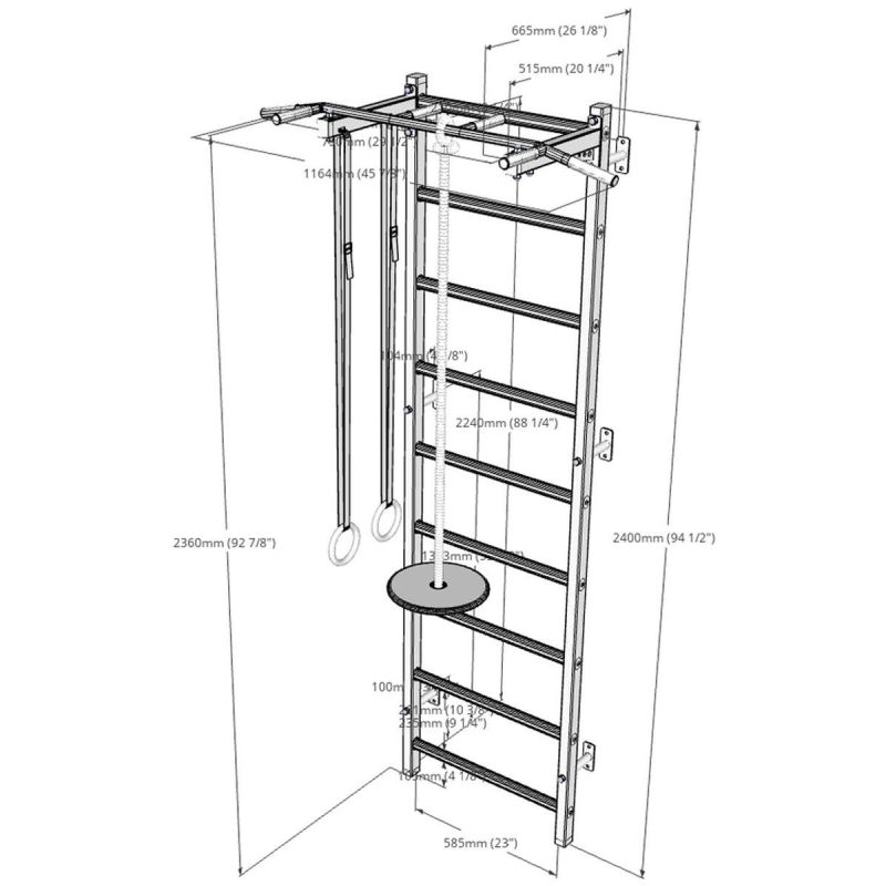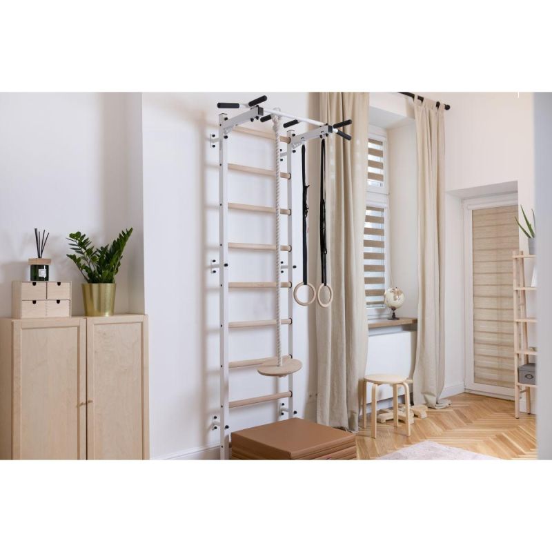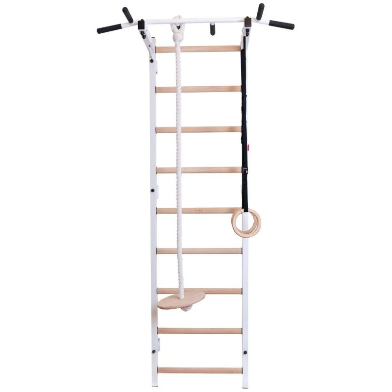 Pionowe profile (50 mm x 40 mm) drabinki są wykonane z wysokiej jakości, malowanego proszkowo metalu. Szczebelki zrobione są z bukowego drewna o owalnym kształcie, ich powierzchnia została ręcznie pomalowana olejem. Na górnej części drabinki znajduje się zamontowany na stałe metalowy drążek do podciągania. Drążek do podciągania posiada 6 rączek, które pozwalają wykonywać ćwiczenia ramion i pleców przy użyciu różnych chwytów. Długość drążka do podciągania to 115 cm.