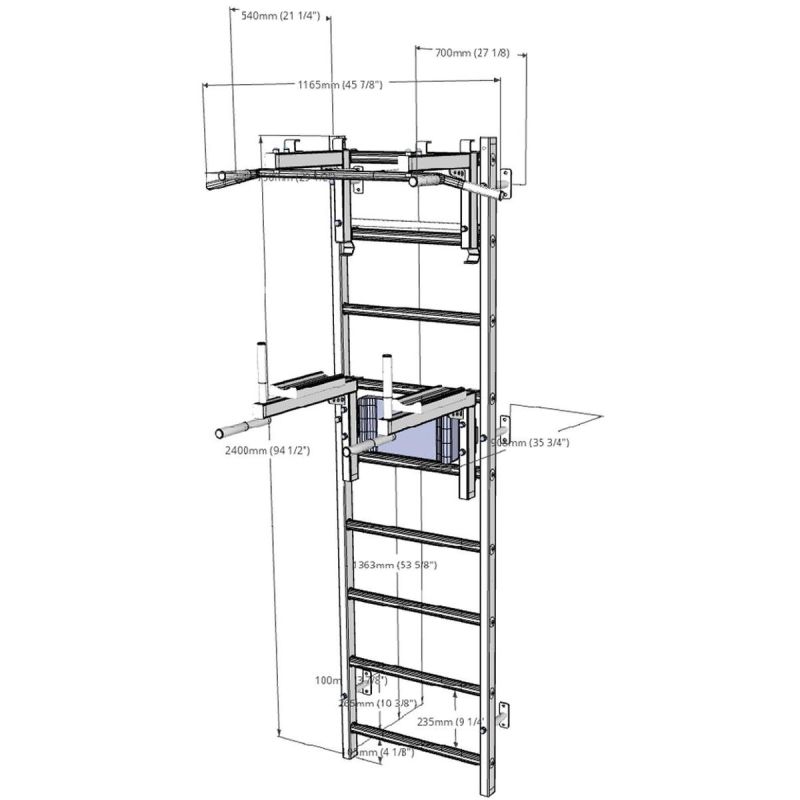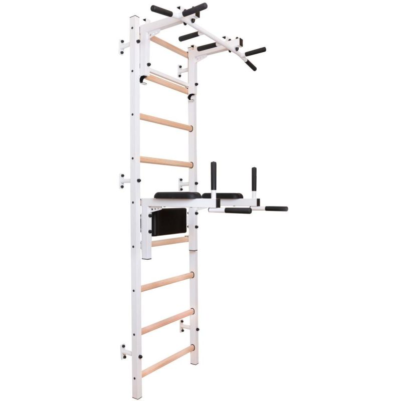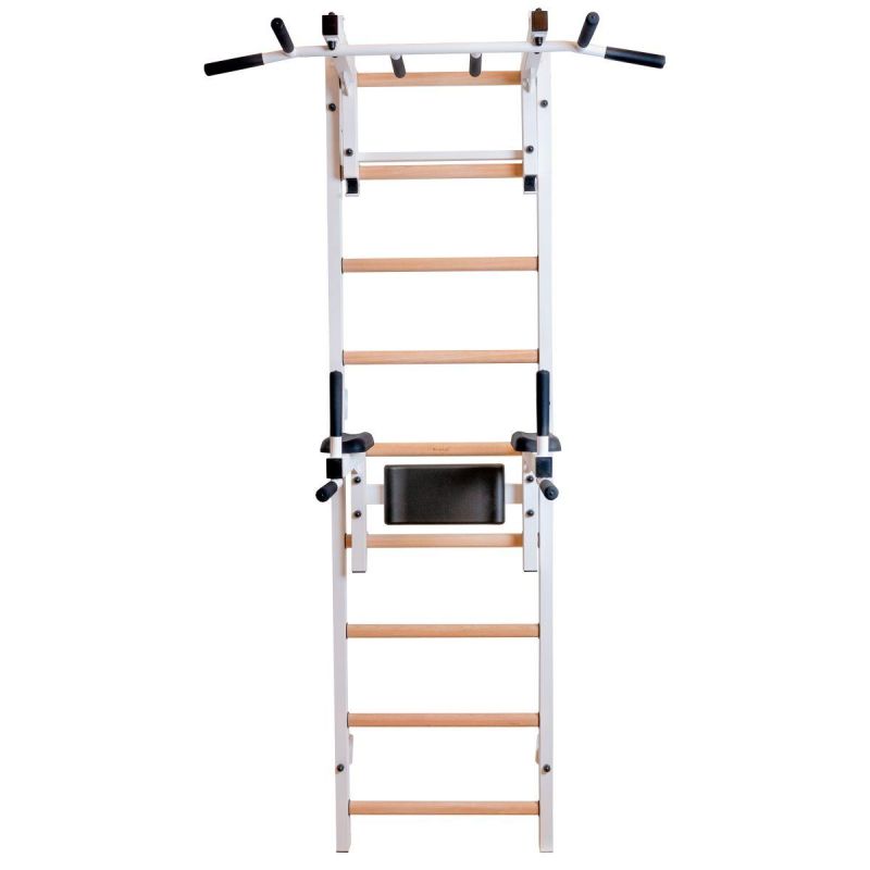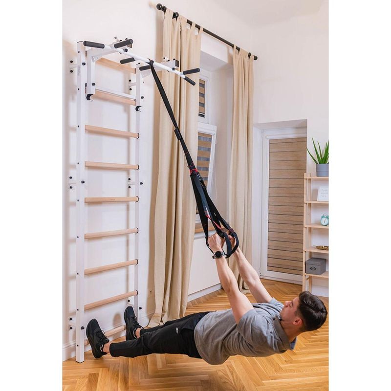 Drabinka gimnastyczna z regulowanym drążkiem oraz poręczą to model, który idealnie pasuje do skandynawskiego stylu wnętrz. Pionowe profile (40mm x 50 mm) wykonane są z wysokiej jakości metalu pomalowanego proszkowo. Szczebelki są wykonane z buku o owalnym kształcie, powierzchnia szczebelków jestb olejowana ręcznie, to wszystko wpływa na to, że użytkowanie drabinki jest komfortowe. W górnej części drabinki znajduje się zdejmowany metalowy drążek do podciągania, który wyposażony jest w 6 różnych rączek pozwalających pracować nad siłą mięśni ramion i pleców za pomocą różnych chwytów, np. chwytem szerokim. Drabinka stworzona została z myślą o osobach, które chcą pracować nad swoją sylwetką w zaciszu swojego domu. Drabinka pozwala wykonywać wiele różnorodnych ćwiczeń, nie zajmując przy tym dużo miejsca. Design przemyślano tak, aby pasował do aktualnych trendów w aranżacji wnętrz, nie zaburzając ogólnego wystroju mieszkania. Jedna osoba dorosła może zmienić regulację wysokości drążka oraz zmienić pozycję. Jeżeli obrócimy drążek do podciągania, będzie on słuzył jako uchwyt pod sztangę.