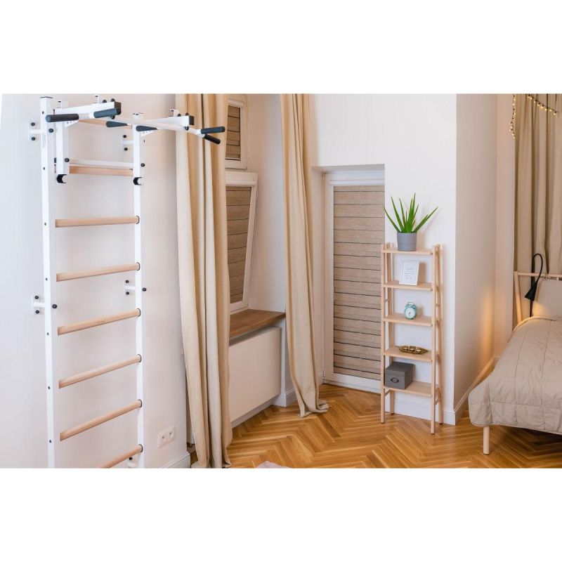 Drabinka gimnastyczna z regulowanym drążkiem to model, który idealnie pasuje do skandynawskiego stylu wnętrz. Pionowe profile (40mm x 50 mm) wykonane są z wysokiej jakości metalu pomalowanego proszkowo. Szczebelki są wykonane z buku o owalnym kształcie, powierzchnia szczebelków jestb olejowana ręcznie, to wszystko wpływa na to, że użytkowanie drabinki jest komfortowe. W górnej części drabinki znajduje się zdejmowany metalowy drążek do podciągania, który wyposażony jest w 6 różnych rączek pozwalających pracować nad siłą mięśni ramion i pleców za pomocą różnych chwytów, np. chwytem szerokim. Drabinka stworzona została z myślą o osobach, które chcą pracować nad swoją sylwetką w zaciszu swojego domu. Drabinka pozwala wykonywać wiele różnorodnych ćwiczeń, nie zajmując przy tym dużo miejsca. Design przemyślano tak, aby pasował do aktualnych trendów w aranżacji wnętrz, nie zaburzając ogólnego wystroju mieszkania. Jedna osoba dorosła może zmienić regulację wysokości drążka oraz zmienić pozycję. Jeżeli obrócimy drążek do podciągania, będzie on słuzył jako uchwyt pod sztangę.